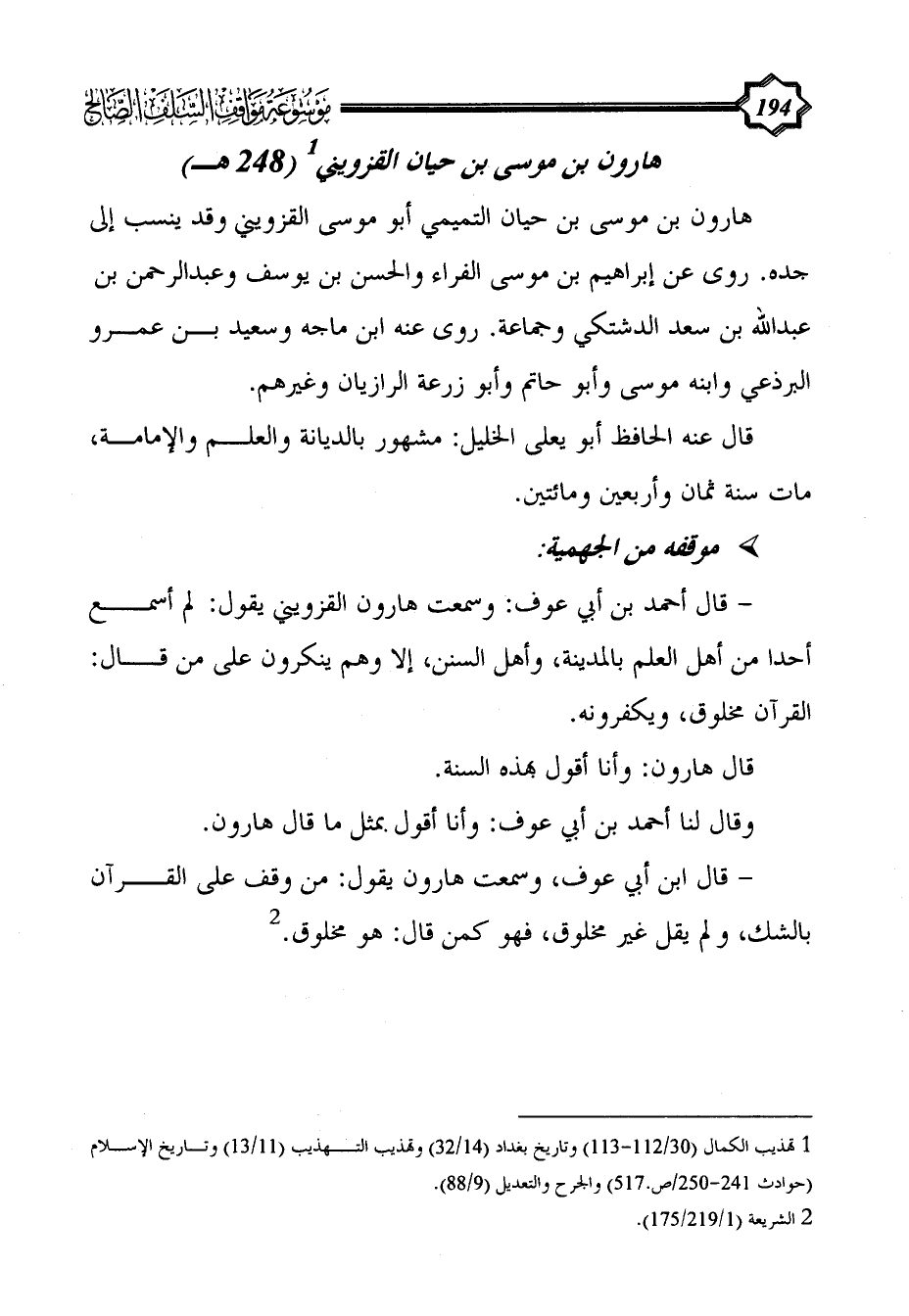 - قال ابن أبي عوف، وسمعت هارون يقول: من وقف على القرآن بالشك، ولم يقل غير مخلوق، فهو كمن قال: هو مخلوق. (¬2)