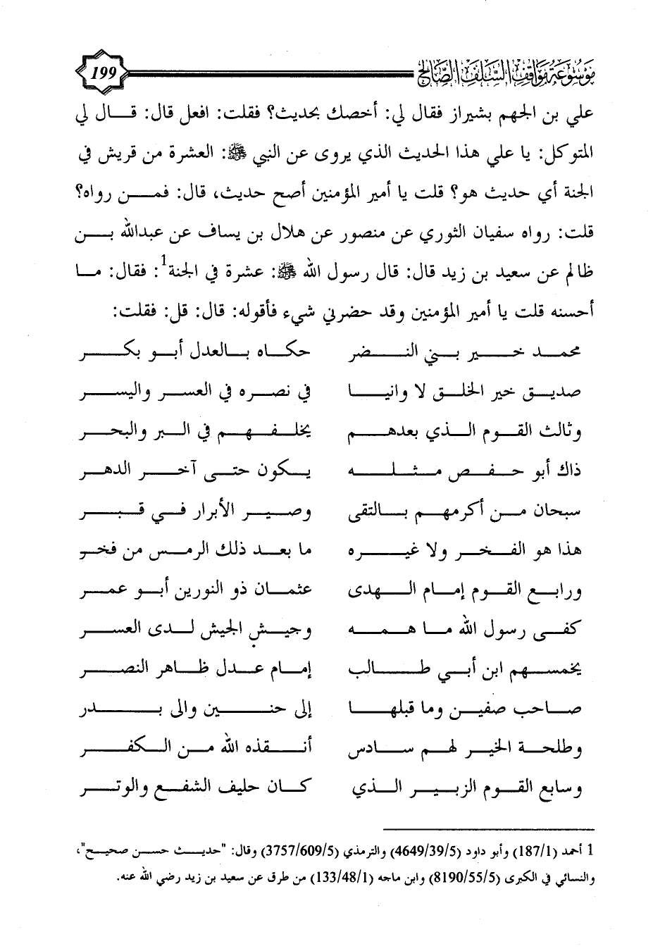 علي بن الجهم بشيراز فقال لي: أخصك بحديث؟ فقلت: افعل قال: قال لي المتوكل: يا علي هذا الحديث الذي يروى عن النبي - صلى الله عليه وسلم -: العشرة من قريش في الجنة أي حديث هو؟ قلت يا أمير المؤمنين أصح حديث، قال: فمن رواه؟ قلت: رواه سفيان الثوري عن منصور عن هلال بن يساف عن عبد الله بن ظالم عن سعيد بن زيد قال: قال رسول الله - صلى الله عليه وسلم -: عشرة في الجنة (¬1): فقال: ما أحسنه قلت يا أمير المؤمنين وقد حضرني شيء فأقوله: قال: قل: فقلت: