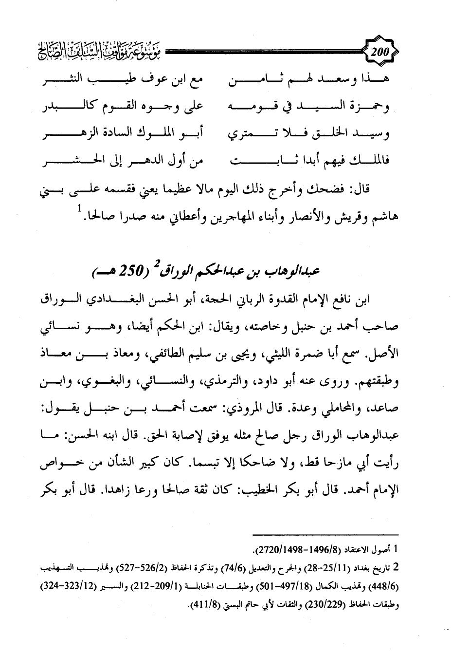 ابن نافع الإمام القدوة الرباني الحجة، أبو الحسن البغدادي الوراق صاحب أحمد بن حنبل وخاصته، ويقال: ابن الحكم أيضا، وهو نسائي الأصل. سمع أبا ضمرة الليثي، ويحيى بن سليم الطائفي، ومعاذ بن معاذ وطبقتهم. وروى عنه أبو داود، والترمذي، والنسائي، والبغوي، وابن صاعد، والمحاملي وعدة. قال المروذي: سمعت أحمد بن حنبل يقول: عبد الوهاب الوراق رجل صالح مثله يوفق لإصابة الحق. قال ابنه الحسن: ما رأيت أبي مازحا قط، ولا ضاحكا إلا تبسما. كان كبير الشأن من خواص الإمام أحمد. قال أبو بكر الخطيب: كان ثقة صالحا ورعا زاهدا. قال أبو بكر