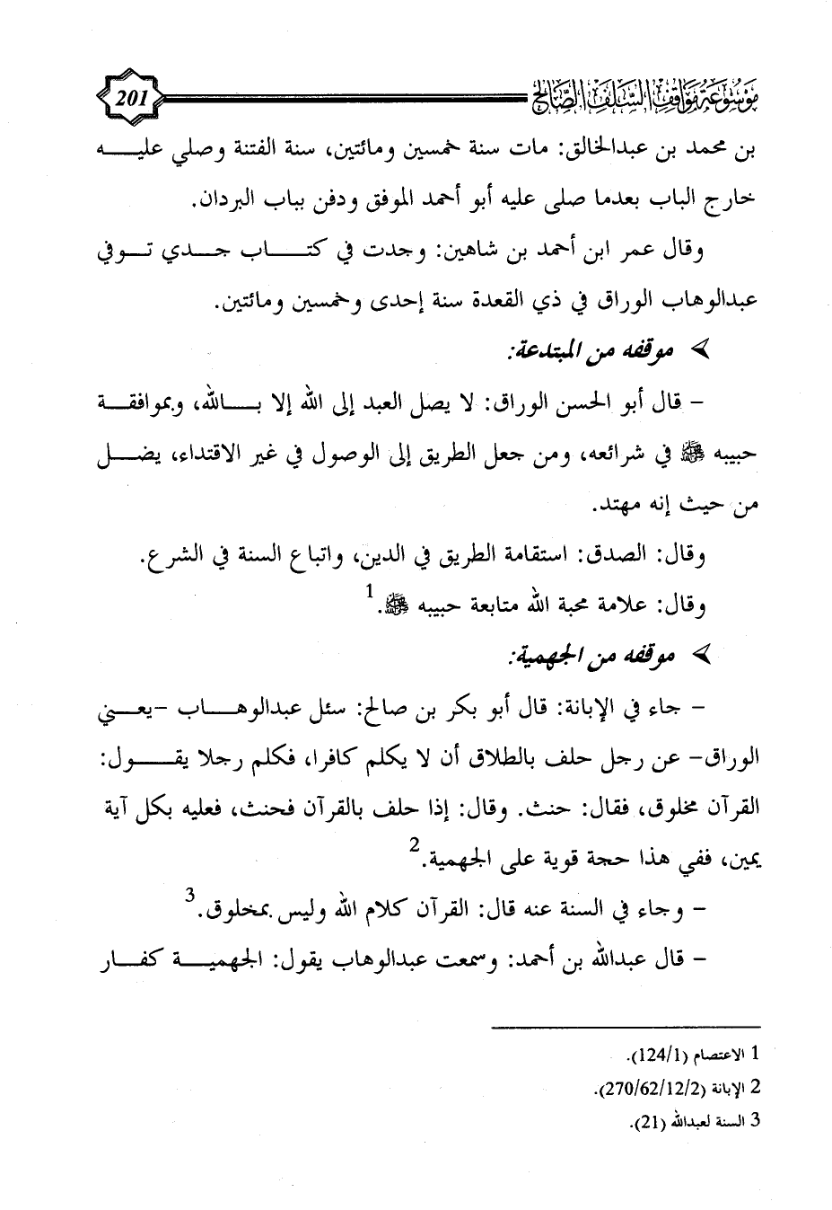 - جاء في الإبانة: قال أبو بكر بن صالح: سئل عبد الوهاب -يعني الوراق- عن رجل حلف بالطلاق أن لا يكلم كافرا، فكلم رجلا يقول: القرآن مخلوق، فقال: حنث. وقال: إذا حلف بالقرآن فحنث، فعليه بكل آية يمين، ففي هذا حجة قوية على الجهمية. (¬2)