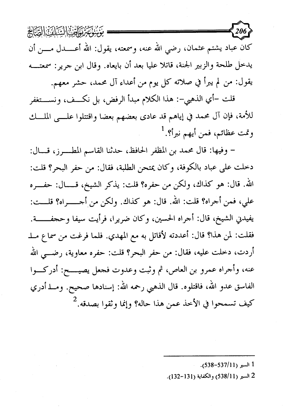 - وفيها: قال محمد بن المظفر الحافظ، حدثنا القاسم المطرِّز، قال: دخلت على عباد بالكوفة، وكان يمتحن الطلبة، فقال: من حفر البحر؟ قلت: الله. قال: هو كذاك، ولكن من حفره؟ قلت: يذكر الشيخ، قال: حفره علي، فمن أجراه؟ قلت: الله. قال: هو كذاك. ولكن من أجراه؟ قلت: يفيدني الشيخ، قال: أجراه الحسين، وكان ضريرا، فرأيت سيفا وحجفة. فقلت: لمن هذا؟ قال: أعددته لأقاتل به مع المهدي. فلما فرغت من سماع ما أردت، دخلت عليه، فقال: من حفر البحر؟ قلت: حفره معاوية، رضي الله عنه، وأجراه عمرو بن العاص، ثم وثبت وعدوت فجعل يصيح: أدركوا الفاسق عدو الله، فاقتلوه. قال الذهبي رحمه الله: إسنادها صحيح. وما أدري كيف تسمحوا في الأخذ عمن هذا حاله؟ وإنما وثقوا بصدقه. (¬2)