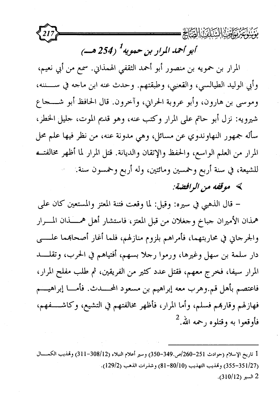 - قال الذهبي في سيره: وقيل: لما وقعت فتنة المعتز والمستعين كان على همذان الأميران جباخ وجغلان من قبل المعتز، فاستشار أهل همذان المرار والجرجاني في محاربتهما، فأمراهم بلزوم منازلهم، فلما أغار أصحابهما على دار سلمة بن سهل وغيرها، ورموا رجلا بسهم، أفتياهم في الحرب، وتقلد المرار سيفا، فخرج معهم، فقتل عدد كثير من الفريقين، ثم طلب مفلح المرار، فاعتصم بأهل قم. وهرب معه إبراهيم بن مسعود المحدث. فأما إبراهيم فهازلهم وقاربهم فسلم، وأما المرار، فأظهر مخالفتهم في التشيع، وكاشفهم، فأوقعوا به وقتلوه رحمه الله. (¬2)