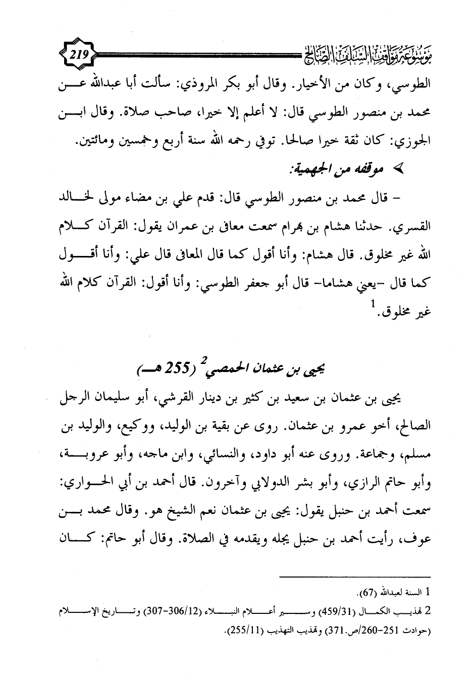 - قال محمد بن منصور الطوسي قال: قدم علي بن مضاء مولى لخالد القسري. حدثنا هشام بن بهرام سمعت معافى بن عمران يقول: القرآن كلام الله غير مخلوق. قال هشام: وأنا أقول كما قال المعافى قال علي: وأنا أقول كما قال -يعني هشاما- قال أبو جعفر الطوسي: وأنا أقول: القرآن كلام الله غير مخلوق. (¬1)
