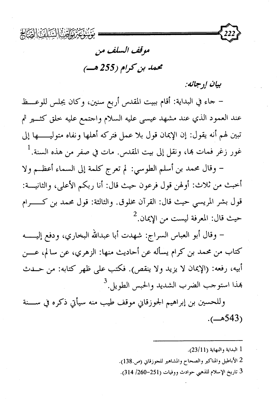 - جاء في البداية: أقام ببيت المقدس أربع سنين، وكان يجلس للوعظ عند العمود الذي عند مشهد عيسى عليه السلام واجتمع عليه خلق كثير ثم تبين لهم أنه يقول: إن الإيمان قول بلا عمل فتركه أهلها ونفاه متوليها إلى غور زغر فمات بها، ونقل إلى بيت المقدس. مات في صفر من هذه السنة. (¬1)