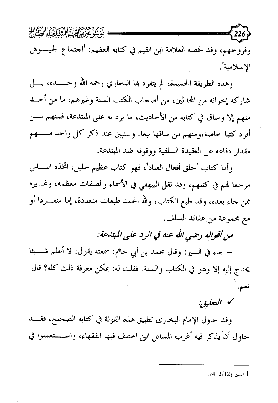 وهذه الطريقة الحميدة، لم يتفرد بها البخاري رحمه الله وحده، بل شاركه إخوانه من المحدثين، من أصحاب الكتب الستة وغيرهم، ما من أحد منهم إلا وساق في كتابه من الأحاديث، ما يرد به على المبتدعة، فمنهم من أفرد كتبا خاصة، ومنهم من ساقها تبعا. وسنبين عند ذكر كل واحد منهم مقدار دفاعه عن العقيدة السلفية ووقوفه ضد المبتدعة.