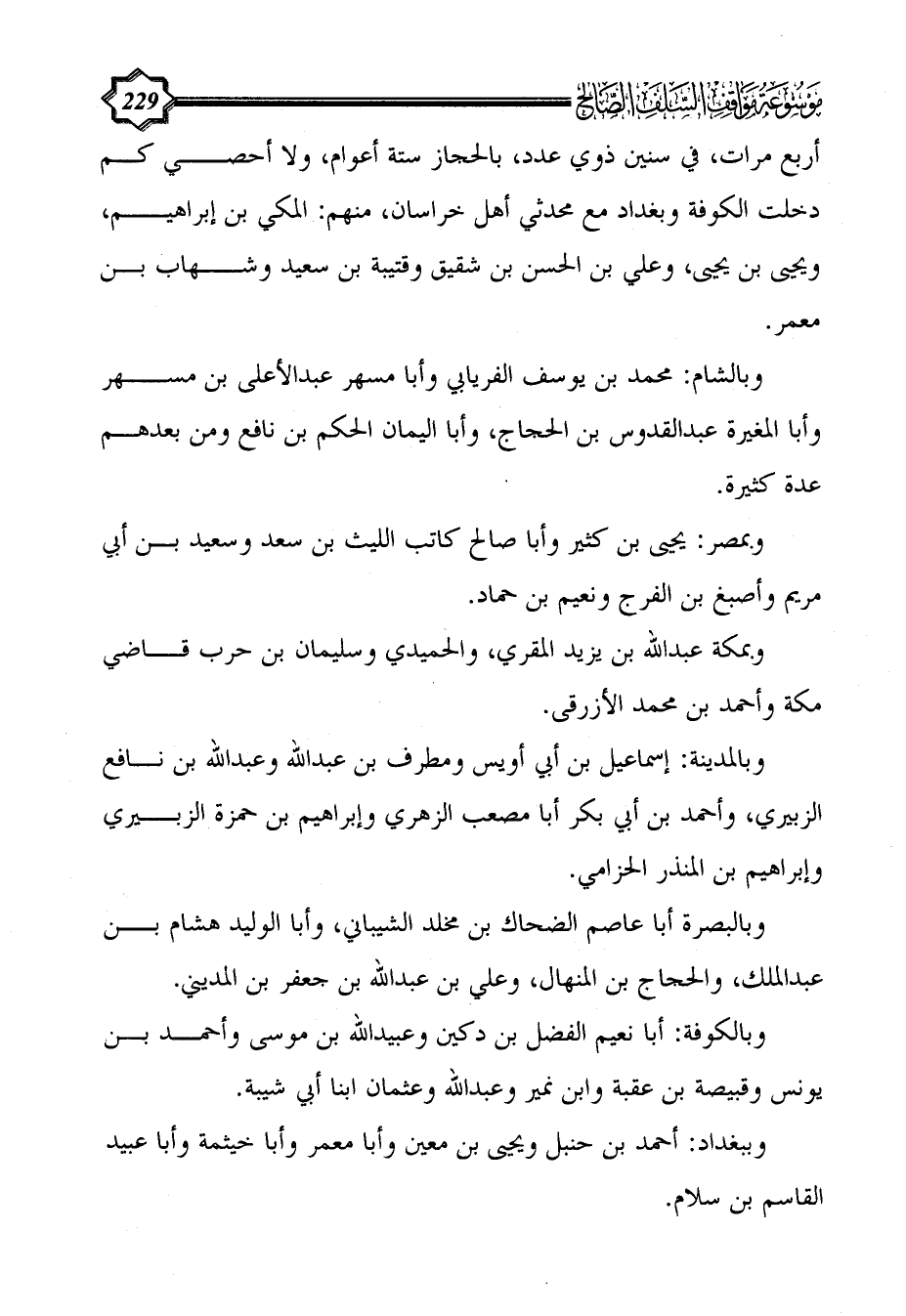 وببغداد: أحمد بن حنبل ويحيى بن معين وأبا معمر وأبا خيثمة وأبا عبيد القاسم بن سلام.