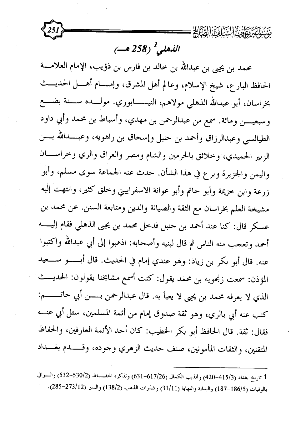 محمد بن يحيى بن عبد الله بن خالد بن فارس بن ذؤيب، الإمام العلامة الحافظ البارع، شيخ الإسلام، وعالم أهل المشرق، وإمام أهل الحديث بخراسان، أبو عبد الله الذهلي مولاهم، النيسابوري. مولده سنة بضع وسبعين ومائة. سمع من عبد الرحمن بن مهدي، وأسباط بن محمد وأبي داود الطيالسي وعبد الرزاق وأحمد بن حنبل وإسحاق بن راهويه، وعبد الله بن الزبير الحميدي، وخلائق بالحرمين والشام ومصر والعراق والري وخراسان واليمن والجزيرة وبرع في هذا الشأن. حدث عنه الجماعة سوى مسلم، وأبو زرعة وابن خزيمة وأبو حاتم وأبو عوانة الاسفراييني وخلق كثير، وانتهت إليه مشيخة العلم بخراسان مع الثقة والصيانة والدين ومتابعة السنن. عن محمد بن عسكر قال: كنا عند أحمد بن حنبل فدخل محمد بن يحيى الذهلي فقام إليه أحمد وتعجب منه الناس ثم قال لبنيه وأصحابه: اذهبوا إلى أبي عبد الله واكتبوا عنه. قال أبو بكر بن زياد: وهو عندي إمام في الحديث. قال أبو سعيد المؤذن: سمعت زنجويه بن محمد يقول: كنت أسمع مشايخنا يقولون: الحديث الذي لا يعرفه محمد بن يحيى لا يعبأ به. قال عبد الرحمن بن أبي حاتم: كتب عنه أبي بالري، وهو ثقة صدوق إمام من أئمة المسلمين، سئل أبي عنه فقال: ثقة. قال الحافظ أبو بكر الخطيب: كان أحد الأئمة العارفين، والحفاظ المتقنين، والثقات المأمونين، صنف حديث الزهري وجوده، وقدم بغداد