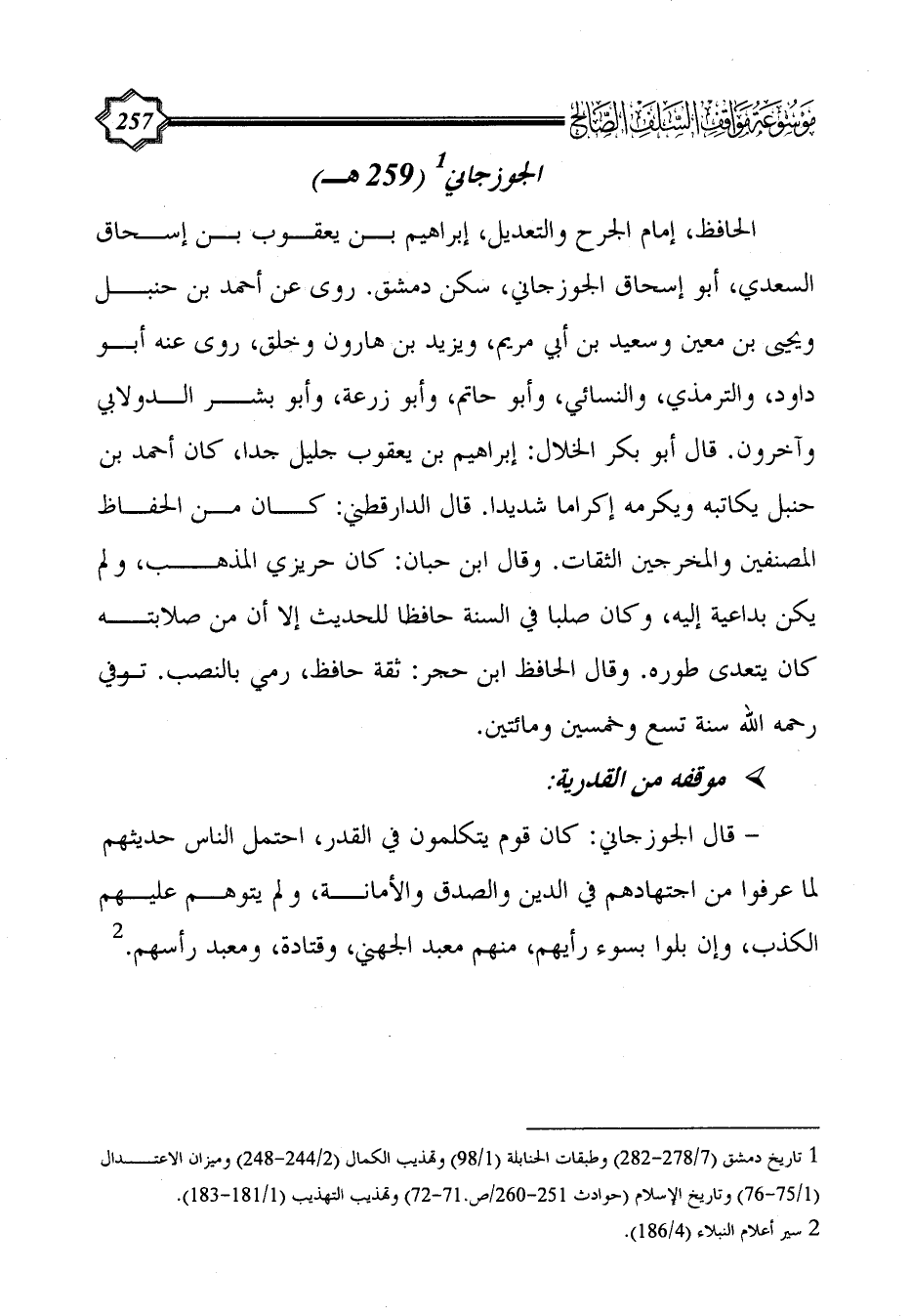 الحافظ، إمام الجرح والتعديل، إبراهيم بن يعقوب بن إسحاق السعدي، أبو إسحاق الجوزجاني، سكن دمشق. روى عن أحمد بن حنبل ويحيى بن معين وسعيد بن أبي مريم، ويزيد بن هارون وخلق، روى عنه أبو داود، والترمذي، والنسائي، وأبو حاتم، وأبو زرعة، وأبو بشر الدولابي وآخرون. قال أبو بكر الخلال: إبراهيم بن يعقوب جليل جدا، كان أحمد بن حنبل يكاتبه ويكرمه إكراما شديدا. قال الدارقطني: كان من الحفاظ المصنفين والمخرجين الثقات. وقال ابن حبان: كان حريزي المذهب، ولم يكن بداعية إليه، وكان صلبا في السنة حافظا للحديث إلا أن من صلابته كان يتعدى طوره. وقال الحافظ ابن حجر: ثقة حافظ، رمي بالنصب. توفي رحمه الله سنة تسع وخمسين ومائتين.