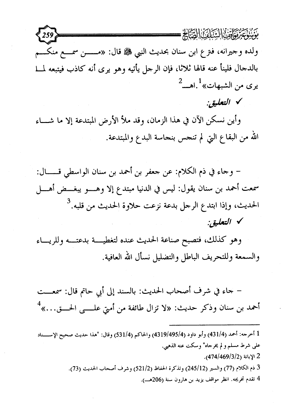 - وجاء في ذم الكلام: عن جعفر بن أحمد بن سنان الواسطي قال: سمعت أحمد بن سنان يقول: ليس في الدنيا مبتدع إلا وهو يبغض أهل الحديث، وإذا ابتدع الرجل بدعة نزعت حلاوة الحديث من قلبه. (¬3)