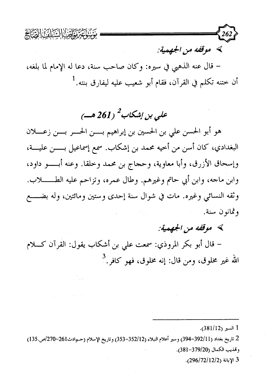 - قال أبو بكر المروذي: سمعت علي بن أشكاب يقول: القرآن كلام الله غير مخلوق، ومن قال: إنه مخلوق، فهو كافر. (¬3)