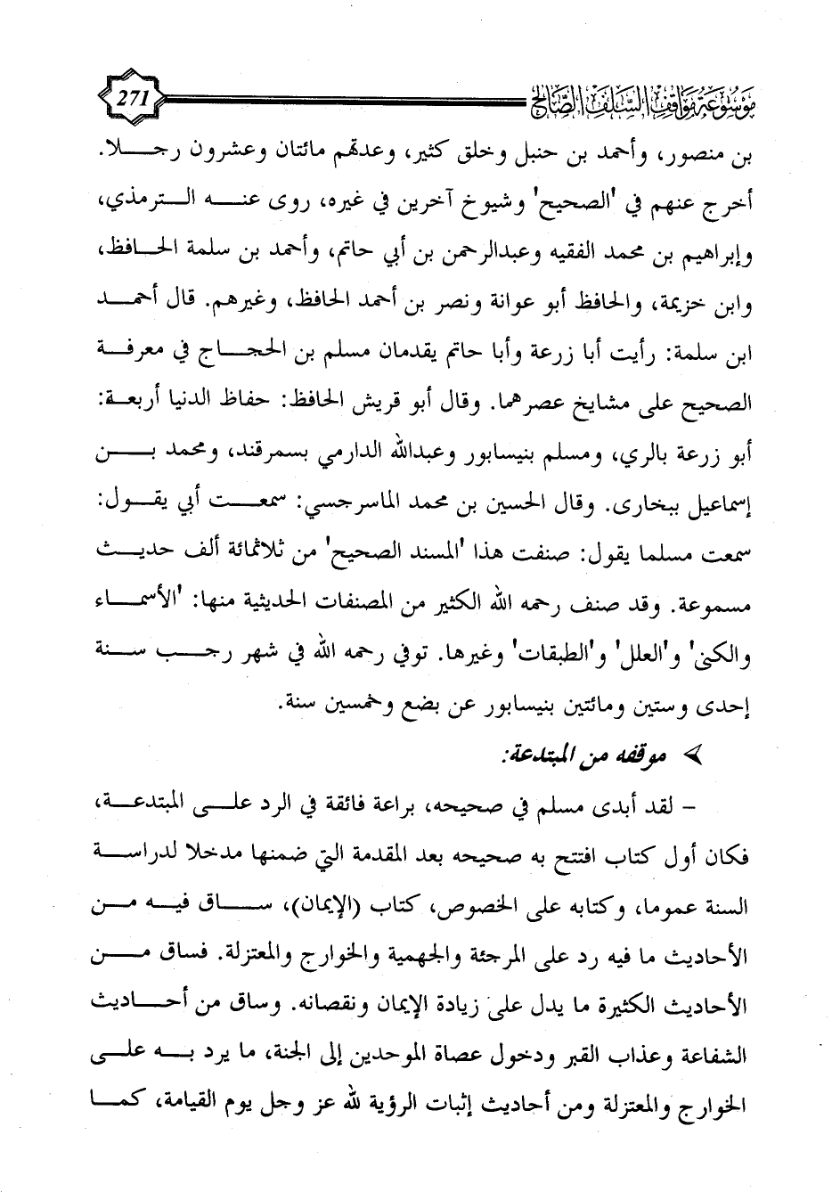 - لقد أبدى مسلم في صحيحه، براعة فائقة في الرد على المبتدعة، فكان أول كتاب افتتح به صحيحه بعد المقدمة التي ضمنها مدخلا لدراسة السنة عموما، وكتابه على الخصوص، كتاب (الإيمان)، ساق فيه من الأحاديث ما فيه رد على المرجئة والجهمية والخوارج والمعتزلة. فساق من الأحاديث الكثيرة ما يدل على زيادة الإيمان ونقصانه. وساق من أحاديث الشفاعة وعذاب القبر ودخول عصاة الموحدين إلى الجنة، ما يرد به على الخوارج والمعتزلة ومن أحاديث إثبات الرؤية لله عز وجل يوم القيامة، كما
