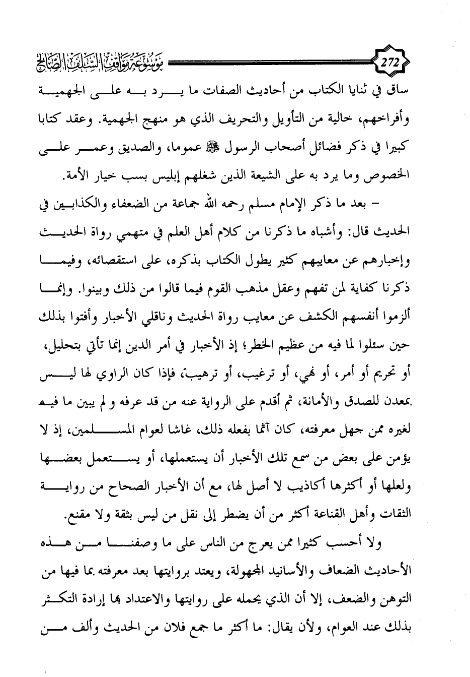 - بعد ما ذكر الإمام مسلم رحمه الله جماعة من الضعفاء والكذابين في الحديث قال: وأشباه ما ذكرنا من كلام أهل العلم في متهمي رواة الحديث وإخبارهم عن معايبهم كثير يطول الكتاب بذكره، على استقصائه، وفيما ذكرنا كفاية لمن تفهم وعقل مذهب القوم فيما قالوا من ذلك وبينوا. وإنما ألزموا أنفسهم الكشف عن معايب رواة الحديث وناقلي الأخبار وأفتوا بذلك حين سئلوا لما فيه من عظيم الخطر؛ إذ الأخبار في أمر الدين إنما تأتي بتحليل، أو تحريم أو أمر، أو نهي، أو ترغيب، أو ترهيب، فإذا كان الراوي لها ليس بمعدن للصدق والأمانة، ثم أقدم على الرواية عنه من قد عرفه ولم يبين ما فيه لغيره ممن جهل معرفته، كان آثما بفعله ذلك، غاشا لعوام المسلمين، إذ لا يؤمن على بعض من سمع تلك الأخبار أن يستعملها، أو يستعمل بعضها ولعلها أو أكثرها أكاذيب لا أصل لها، مع أن الأخبار الصحاح من رواية الثقات وأهل القناعة أكثر من أن يضطر إلى نقل من ليس بثقة ولا مقنع.