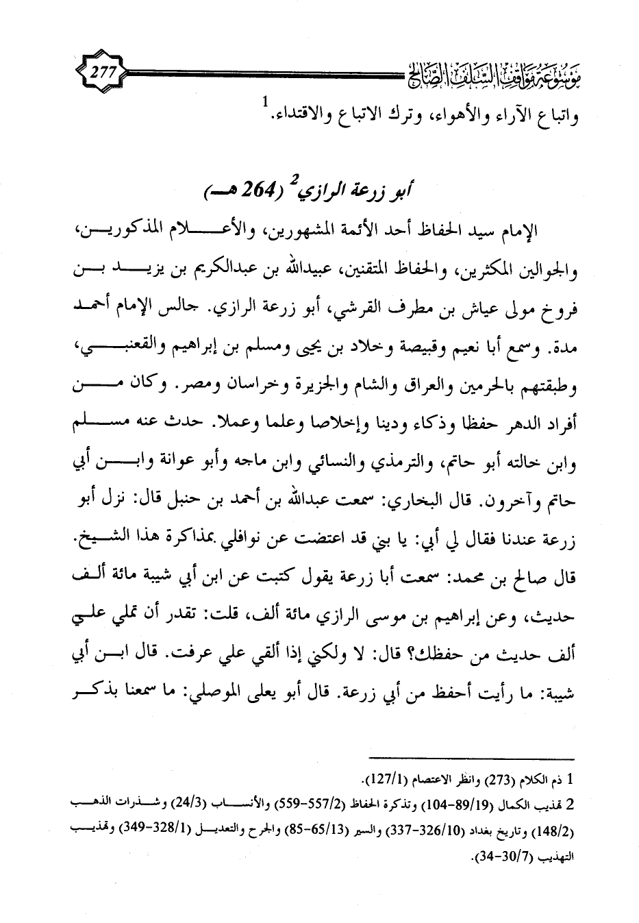 الإمام سيد الحفاظ أحد الأئمة المشهورين، والأعلام المذكورين، والجوالين المكثرين، والحفاظ المتقنين، عبيد الله بن عبد الكريم بن يزيد بن فروخ مولى عياش بن مطرف القرشي، أبو زرعة الرازي. جالس الإمام أحمد مدة. وسمع أبا نعيم وقبيصة وخلاد بن يحيى ومسلم بن إبراهيم والقعنبي، وطبقتهم بالحرمين والعراق والشام والجزيرة وخراسان ومصر. وكان من أفراد الدهر حفظا وذكاء ودينا وإخلاصا وعلما وعملا. حدث عنه مسلم وابن خالته أبو حاتم، والترمذي والنسائي وابن ماجه وأبو عوانة وابن أبي حاتم وآخرون. قال البخاري: سمعت عبد الله بن أحمد بن حنبل قال: نزل أبو زرعة عندنا فقال لي أبي: يا بني قد اعتضت عن نوافلي بمذاكرة هذا الشيخ. قال صالح بن محمد: سمعت أبا زرعة يقول كتبت عن ابن أبي شيبة مائة ألف حديث، وعن إبراهيم بن موسى الرازي مائة ألف، قلت: تقدر أن تملي علي ألف حديث من حفظك؟ قال: لا ولكني إذا ألقي علي عرفت. قال ابن أبي شيبة: ما رأيت أحفظ من أبي زرعة. قال أبو يعلى الموصلي: ما سمعنا بذكر