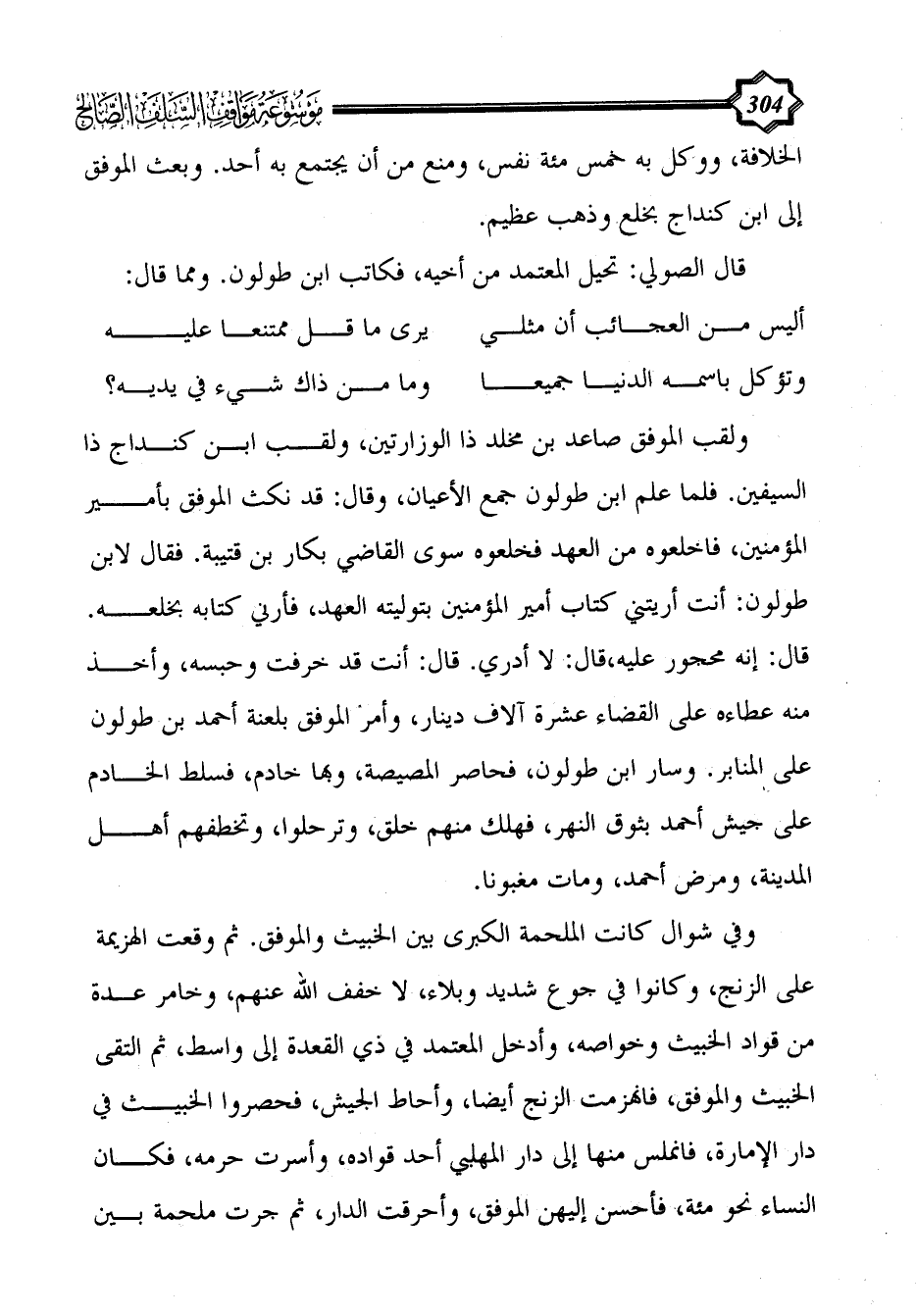 ولقب الموفق صاعد بن مخلد ذا الوزارتين، ولقب ابن كنداج ذا السيفين. فلما علم ابن طولون جمع الأعيان، وقال: قد نكث الموفق بأمير المؤمنين، فاخلعوه من العهد فخلعوه سوى القاضي بكار بن قتيبة. فقال لابن طولون: أنت أريتني كتاب أمير المؤمنين بتوليته العهد، فأرني كتابه بخلعه. قال: إنه محجور عليه، قال: لا أدري. قال: أنت قد خرفت وحبسه، وأخذ منه عطاءه على القضاء عشرة آلاف دينار، وأمر الموفق بلعنة أحمد بن طولون على المنابر. وسار ابن طولون، فحاصر المصيصة، وبها خادم، فسلط الخادم على جيش أحمد بثوق النهر، فهلك منهم خلق، وترحلوا، وتخطفهم أهل المدينة، ومرض أحمد، ومات مغبونا.