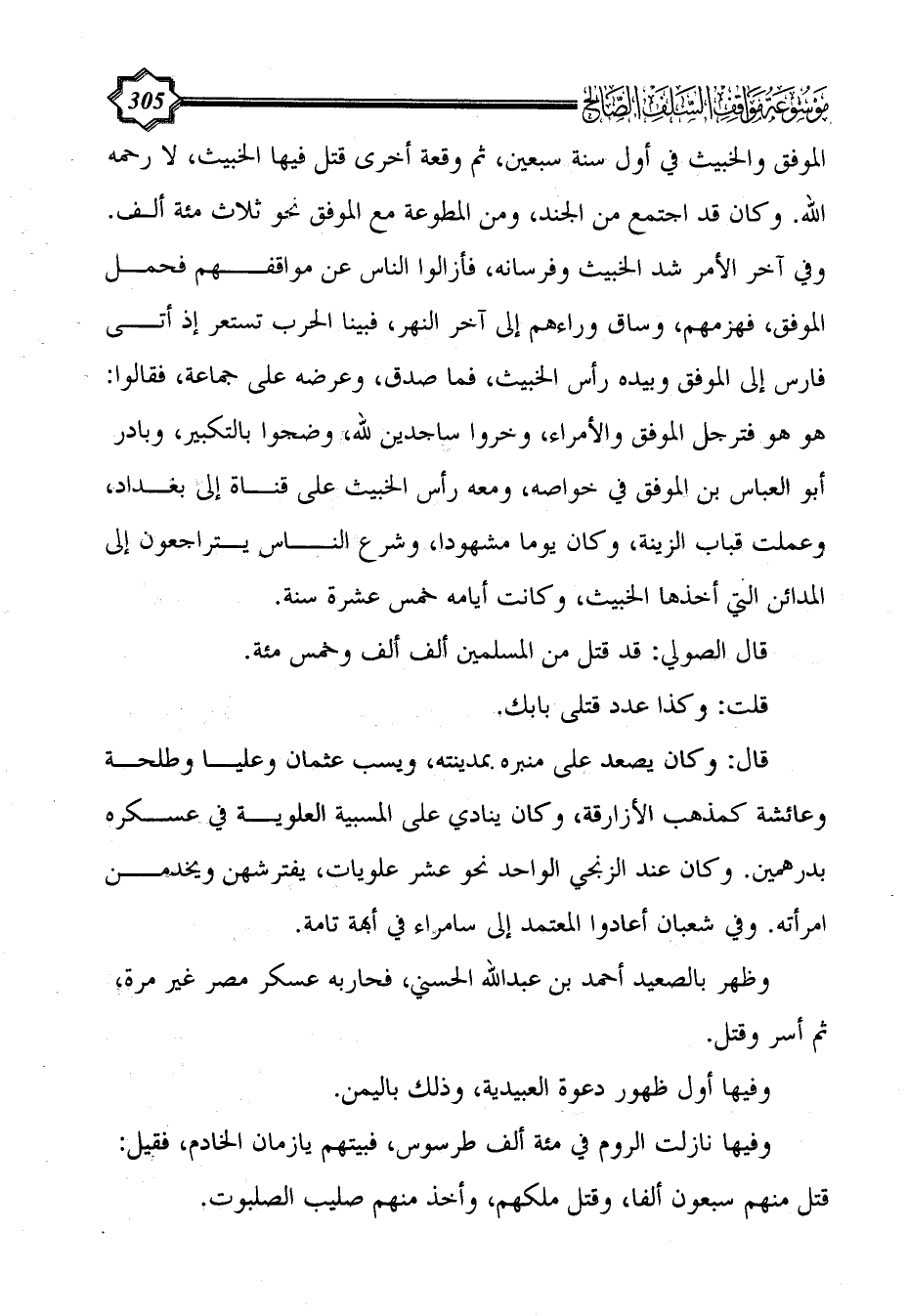 الموفق والخبيث في أول سنة سبعين، ثم وقعة أخرى قتل فيها الخبيث، لا رحمه الله. وكان قد اجتمع من الجند، ومن المطوعة مع الموفق نحو ثلاث مئة ألف. وفي آخر الأمر شد الخبيث وفرسانه، فأزالوا الناس عن مواقفهم فحمل الموفق، فهزمهم، وساق وراءهم إلى آخر النهر، فبينا الحرب تستعر إذ أتى فارس إلى الموفق وبيده رأس الخبيث، فما صدق، وعرضه على جماعة، فقالوا: هو هو فترجل الموفق والأمراء، وخروا ساجدين لله، وضجوا بالتكبير، وبادر أبو العباس بن الموفق في خواصه، ومعه رأس الخبيث على قناة إلى بغداد، وعملت قباب الزينة، وكان يوما مشهودا، وشرع الناس يتراجعون إلى المدائن التي أخذها الخبيث، وكانت أيامه خمس عشرة سنة.