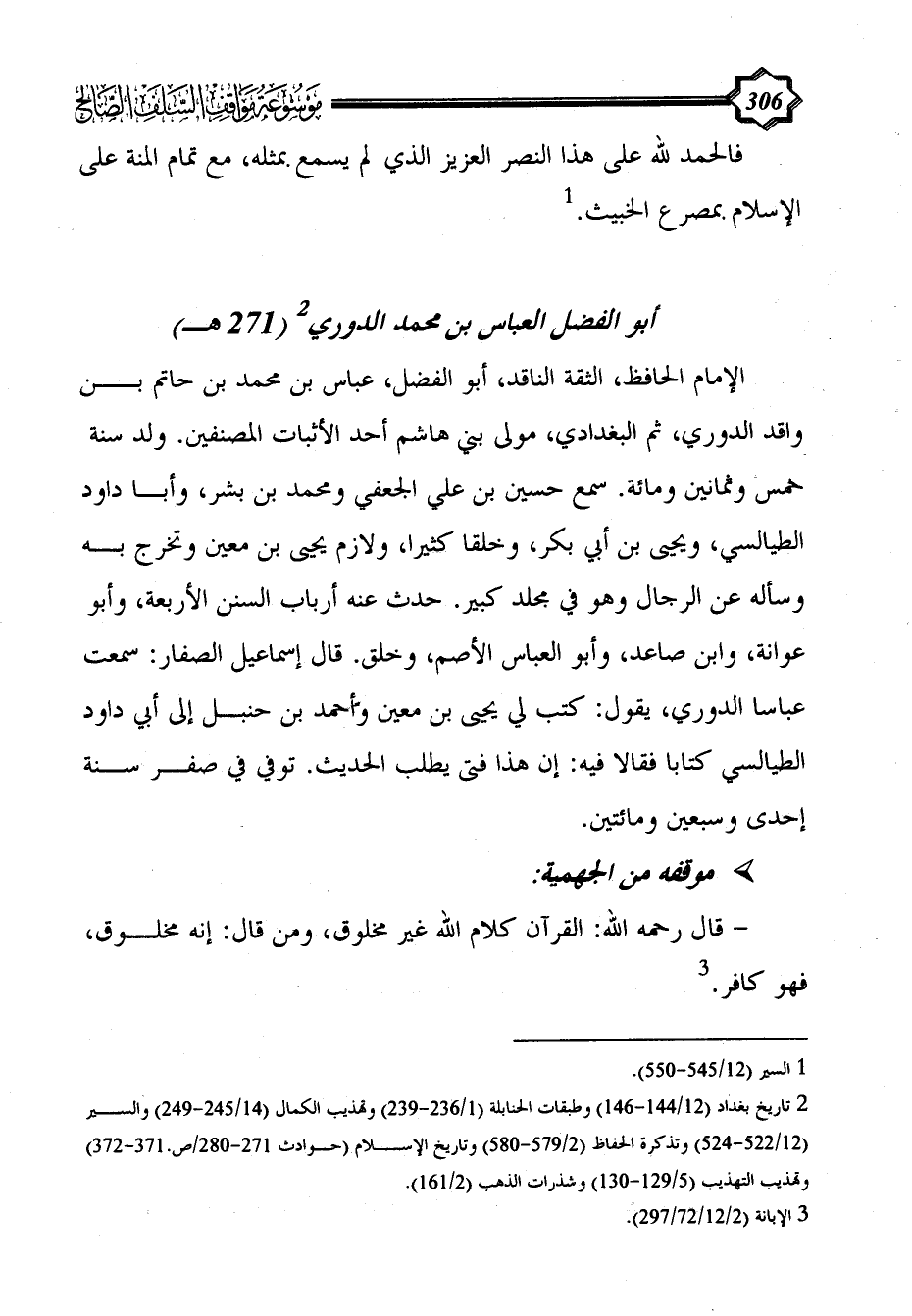 (¬2) تاريخ بغداد (12/ 144 - 146) وطبقات الحنابلة (1/ 236 - 239) وتهذيب الكمال (14/ 245 - 249) والسير (12/ 522 - 524) وتذكرة الحفاظ (2/ 579 - 580) وتاريخ الإسلام (حوادث 271 - 280/ص.371 - 372) وتهذيب التهذيب (5/ 129 - 130) وشذرات الذهب (2/ 161).