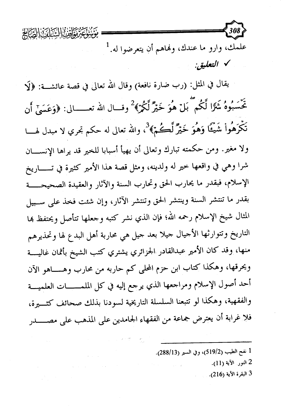 ومن حكمته تبارك وتعالى أن يهيأ أسبابا للخير قد يراها الإنسان شرا وهي في واقعها خير له ولدينه، ومثل قصة هذا الأمير كثيرة في تاريخ الإسلام، فبقدر ما يحارب الحق وتحارب السنة والآثار والعقيدة الصحيحة بقدر ما تنتشر السنة وينتشر الحق وتنتشر الآثار، وإن شئت فخذ على سبيل المثال شيخ الإسلام رحمه الله؛ فإن الذي نشر كتبه وجعلها تتأصل ويحتفظ بها التاريخ وتتوارثها الأجيال جيلا بعد جيل هي محاربة أهل البدع لها وتحذيرهم منها، وقد كان الأمير عبد القادر الجزائري يشتري كتب الشيخ بأثمان غالية ويحرقها، وهكذا كتاب ابن حزم المحلى كم حاربه من محارب وهاهو الآن أحد أصول الإسلام ومراجعها الذي يرجع إليه في كل الملمات العلمية والفقهية، وهكذا لو تتبعنا السلسلة التاريخية لسودنا بذلك صحائف كثيرة، فلا غرابة أن يعترض جماعة من الفقهاء الجامدين على المذهب على مصدر