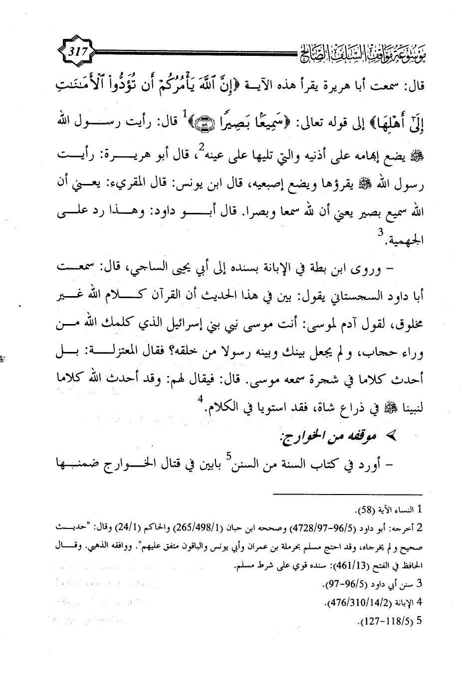 - وروى ابن بطة في الإبانة بسنده إلى أبي يحيى الساجي، قال: سمعت أبا داود السجستاني يقول: بين في هذا الحديث أن القرآن كلام الله غير مخلوق، لقول آدم لموسى: أنت موسى نبي بني إسرائيل الذي كلمك الله من وراء حجاب، ولم يجعل بينك وبينه رسولا من خلقه؟ فقال المعتزلة: بل أحدث كلاما في شجرة سمعه موسى. قال: فيقال لهم: وقد أحدث الله كلاما لنبينا - صلى الله عليه وسلم - في ذراع شاة، فقد استويا في الكلام. (¬4)