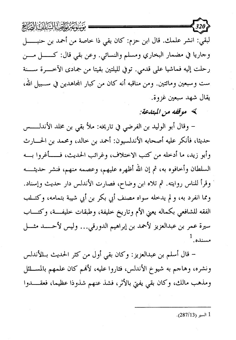 - وقال أبو الوليد بن الفرضي في تاريخه: ملأ بقي بن مخلد الأندلس حديثا، فأنكر عليه أصحابه الأندلسيون: أحمد بن خالد، ومحمد بن الحارث وأبو زيد، ما أدخله من كتب الاختلاف، وغرائب الحديث، فأغروا به السلطان وأخافوه به، ثم إن الله أظهره عليهم، وعصمه منهم، فنشر حديثه وقرأ للناس روايته. ثم تلاه ابن وضاح، فصارت الأندلس دار حديث وإسناد. ومما انفرد به، ولم يدخله سواه مصنف أبي بكر بن أبي شيبة بتمامه، وكتاب الفقه للشافعي بكماله يعني الأم وتاريخ خليفة، وطبقات خليفة، وكتاب سيرة عمر بن عبد العزيز لأحمد بن إبراهيم الدورقي ... وليس لأحد مثل مسنده. (¬1)
