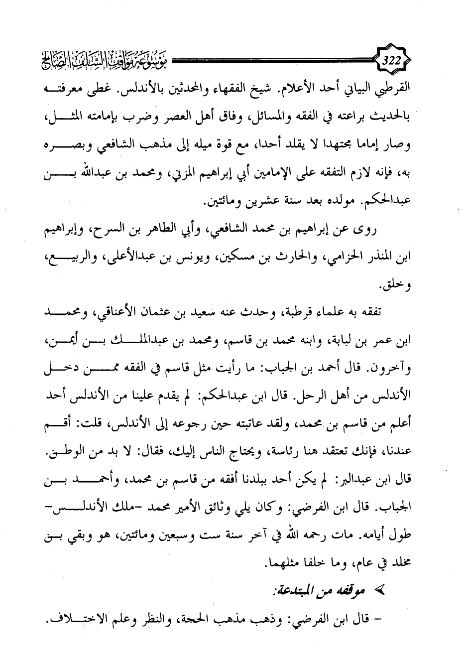 القرطبي البياني أحد الأعلام. شيخ الفقهاء والمحدثين بالأندلس. غطى معرفتَه بالحديث براعتُه في الفقه والمسائل، وفاق أهل العصر وضرب بإمامته المثل، وصار إماما مجتهدا لا يقلد أحدا، مع قوة ميله إلى مذهب الشافعي وبصره به، فإنه لازم التفقه على الإمامين أبي إبراهيم المزني، ومحمد بن عبد الله بن عبد الحكم. مولده بعد سنة عشرين ومائتين.