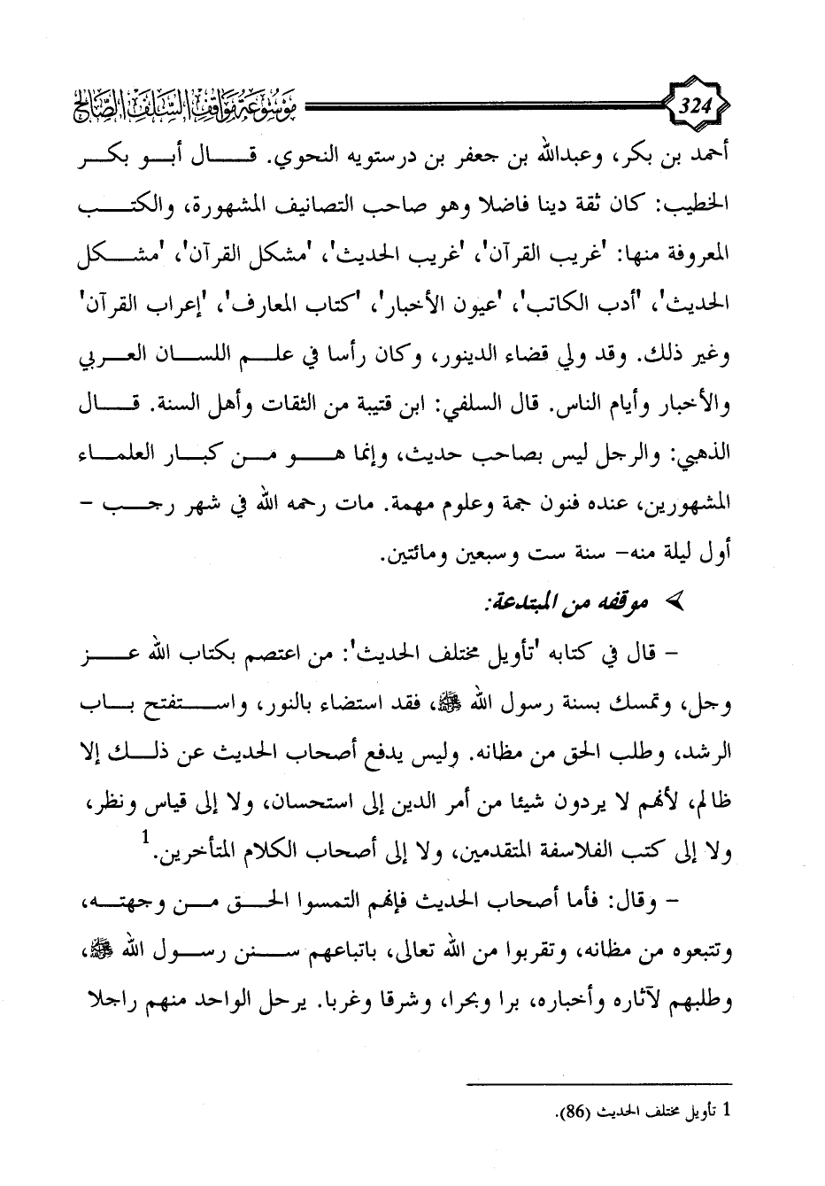 - قال في كتابه 'تأويل مختلف الحديث': من اعتصم بكتاب الله عز وجل، وتمسك بسنة رسول الله - صلى الله عليه وسلم -، فقد استضاء بالنور، واستفتح باب الرشد، وطلب الحق من مظانه. وليس يدفع أصحاب الحديث عن ذلك إلا ظالم، لأنهم لا يردون شيئا من أمر الدين إلى استحسان، ولا إلى قياس ونظر، ولا إلى كتب الفلاسفة المتقدمين، ولا إلى أصحاب الكلام المتأخرين. (¬1)