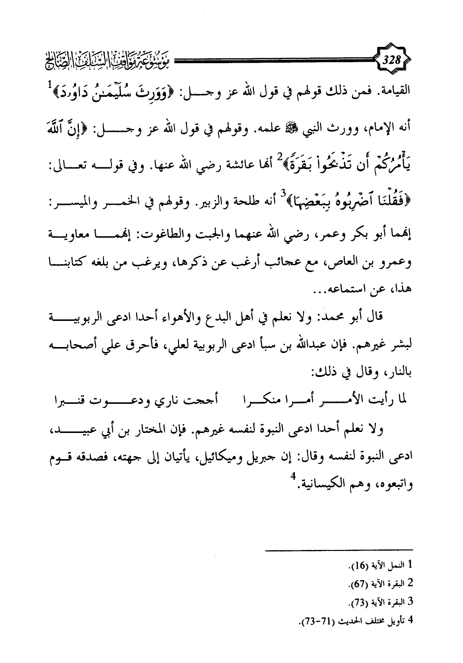 القيامة. فمن ذلك قولهم في قول الله عز وجل: {وَوَرِثَ سُلَيْمَانُ دَاوُودَ} (¬1) أنه الإمام، وورث النبي - صلى الله عليه وسلم - علمه. وقولهم في قول الله عز وجل: {إِنَّ اللَّهَ يَأْمُرُكُمْ أَنْ تَذْبَحُوا بَقَرَةً} (¬2) أنها عائشة رضي الله عنها. وفي قوله تعالى: {فَقُلْنَا اضْرِبُوهُ بِبَعْضِهَا} (¬3) أنه طلحة والزبير. وقولهم في الخمر والميسر: إنهما أبو بكر وعمر، رضي الله عنهما والجبت والطاغوت: إنهما معاوية وعمرو بن العاص، مع عجائب أرغب عن ذكرها، ويرغب من بلغه كتابنا هذا، عن استماعه ...