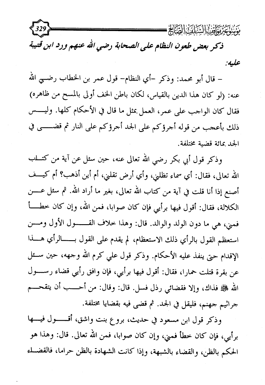 - قال أبو محمد: وذكر -أي النظام- قول عمر بن الخطاب رضي الله عنه: (لو كان هذا الدين بالقياس، لكان باطن الخف أولى بالمسح من ظاهره) فقال كان الواجب على عمر، العمل بمثل ما قال في الأحكام كلها. وليس ذلك بأعجب من قوله أجرؤكم على الجد أجرؤكم على النار ثم قضى في الجد بمائة قضية مختلفة.
