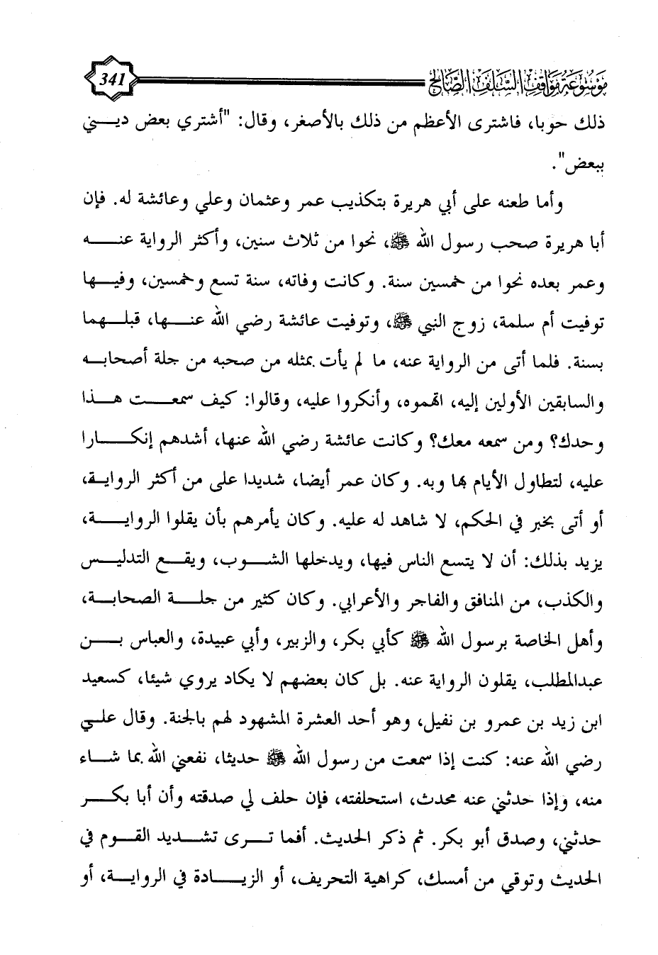 وأما طعنه على أبي هريرة بتكذيب عمر وعثمان وعلي وعائشة له. فإن أبا هريرة صحب رسول الله - صلى الله عليه وسلم -، نحوا من ثلاث سنين، وأكثر الرواية عنه وعمر بعده نحوا من خمسين سنة. وكانت وفاته، سنة تسع وخمسين، وفيها توفيت أم سلمة، زوج النبي - صلى الله عليه وسلم -، وتوفيت عائشة رضي الله عنها، قبلهما بسنة. فلما أتى من الرواية عنه، ما لم يأت بمثله من صحبه من جلة أصحابه والسابقين الأولين إليه، اتهموه، وأنكروا عليه، وقالوا: كيف سمعت هذا وحدك؟ ومن سمعه معك؟ وكانت عائشة رضي الله عنها، أشدهم إنكارا عليه، لتطاول الأيام بها وبه. وكان عمر أيضا، شديدا على من أكثر الرواية، أو أتى بخبر في الحكم، لا شاهد له عليه. وكان يأمرهم بأن يقلوا الرواية، يزيد بذلك: أن لا يتسع الناس فيها، ويدخلها الشوب، ويقع التدليس والكذب، من المنافق والفاجر والأعرابي. وكان كثير من جلة الصحابة، وأهل الخاصة برسول الله - صلى الله عليه وسلم - كأبي بكر، والزبير، وأبي عبيدة، والعباس بن عبد المطلب، يقلون الرواية عنه. بل كان بعضهم لا يكاد يروي شيئا، كسعيد ابن زيد بن عمرو بن نفيل، وهو أحد العشرة المشهود لهم بالجنة. وقال علي رضي الله عنه: كنت إذا سمعت من رسول الله - صلى الله عليه وسلم - حديثا، نفعني الله بما شاء منه، وإذا حدثني عنه محدث، استحلفته، فإن حلف لي صدقته وأن أبا بكر حدثني، وصدق أبو بكر. ثم ذكر الحديث. أفما ترى تشديد القوم في الحديث وتوقي من أمسك، كراهية التحريف، أو الزيادة في الرواية، أو