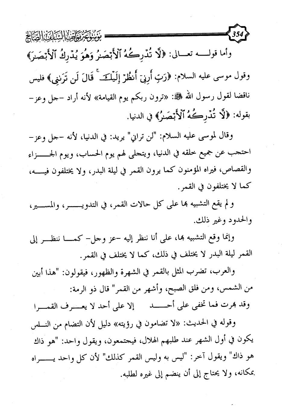 وأما قوله تعالى: {لَا تُدْرِكُهُ الْأَبْصَارُ وَهُوَ يُدْرِكُ الْأَبْصَارَ} وقول موسى عليه السلام: {رَبِّ أَرِنِي أَنْظُرْ إِلَيْكَ قَالَ لَنْ تَرَانِي} فليس ناقضا لقول رسول الله - صلى الله عليه وسلم -: "ترون ربكم يوم القيامة" لأنه أراد -جل وعز- بقوله: {لَا تُدْرِكُهُ الْأَبْصَارُ} في الدنيا.