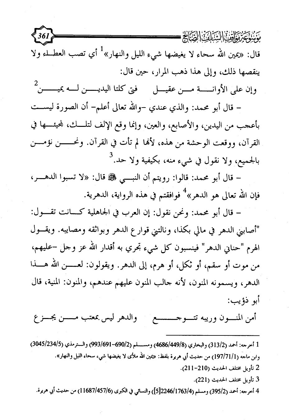 - قال أبو محمد: ونحن نقول: إن العرب في الجاهلية كانت تقول: "أصابني الدهر في مالي بكذا، ونالتني قوارع الدهر وبواثقه ومصايبه. ويقول الهرم "حناني الدهر" فينسبون كل شيء تجري به أقدار الله عز وجل -عليهم، من موت أو سقم، أو ثكل، أو هرم، إلى الدهر. ويقولون: لعن الله هذا الدهر، ويسمونه المنون، لأنه جالب المنون عليهم عندهم، والمنون: المنية، قال أبو ذؤيب: