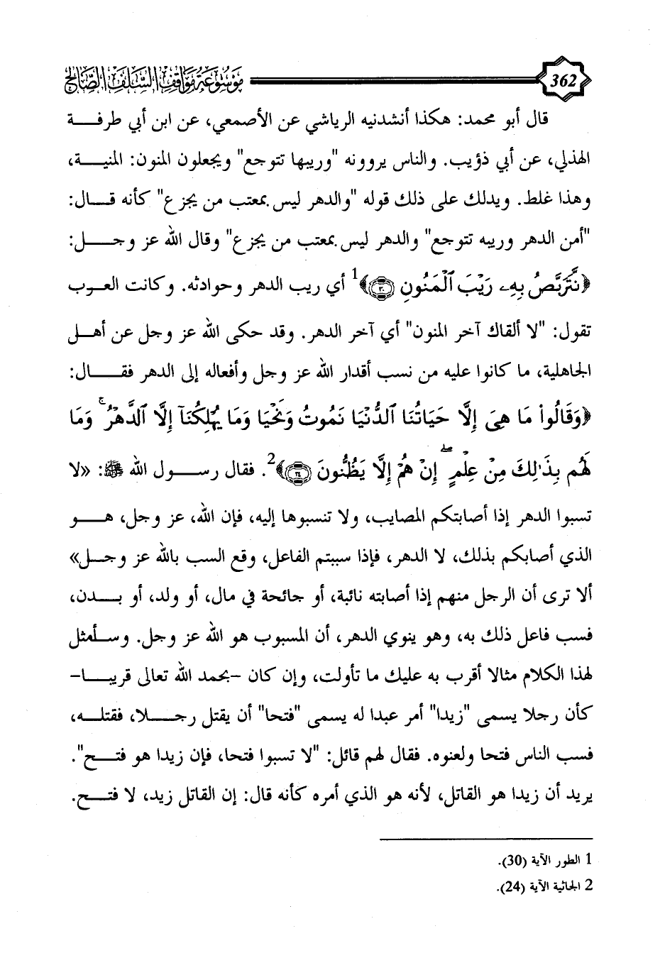 قال أبو محمد: هكذا أنشدنيه الرياشي عن الأصمعي، عن ابن أبي طرفة الهذلي، عن أبي ذؤيب. والناس يروونه "وريبها تتوجع" ويجعلون المنون: المنية، وهذا غلط. ويدلك على ذلك قوله "والدهر ليس بمعتب من يجزع" كأنه قال: "أمن الدهر وريبه تتوجع" والدهر ليس بمعتب من يجزع" وقال الله عز وجل: {نتربص به ريب الْمَنُونِ} (¬1) أي ريب الدهر وحوادثه. وكانت العرب تقول: "لا ألقاك آخر المنون" أي آخر الدهر. وقد حكى الله عز وجل عن أهل الجاهلية، ما كانوا عليه من نسب أقدار الله عز وجل وأفعاله إلى الدهر فقال: {وَقَالُوا مَا هِيَ إِلَّا حَيَاتُنَا الدُّنْيَا نَمُوتُ وَنَحْيَا وَمَا يُهْلِكُنَا إِلَّا الدَّهْرُ وَمَا لَهُمْ بِذَلِكَ مِنْ عِلْمٍ إِنْ هُمْ إِلَّا يَظُنُّونَ} (¬2). فقال رسول الله - صلى الله عليه وسلم -: "لا تسبوا الدهر إذا أصابتكم المصايب، ولا تنسبوها إليه، فإن الله، عز وجل، هو الذي أصابكم بذلك، لا الدهر، فإذا سببتم الفاعل، وقع السب بالله عز وجل" ألا ترى أن الرجل منهم إذا أصابته نائبة، أو جائحة في مال، أو ولد، أو بدن، فسب فاعل ذلك به، وهو ينوي الدهر، أن المسبوب هو الله عز وجل. وسأمثل لهذا الكلام مثالا أقرب به عليك ما تأولت، وإن كان -بحمد الله تعالى قريبا- كأن رجلا يسمى "زيدا" أمر عبدا له يسمى "فتحا" أن يقتل رجلا، فقتله، فسب الناس فتحا ولعنوه. فقال لهم قائل: "لا تسبوا فتحا، فإن زيدا هو فتح". يريد أن زيدا هو القاتل، لأنه هو الذي أمره كأنه قال: إن القاتل زيد، لا فتح.