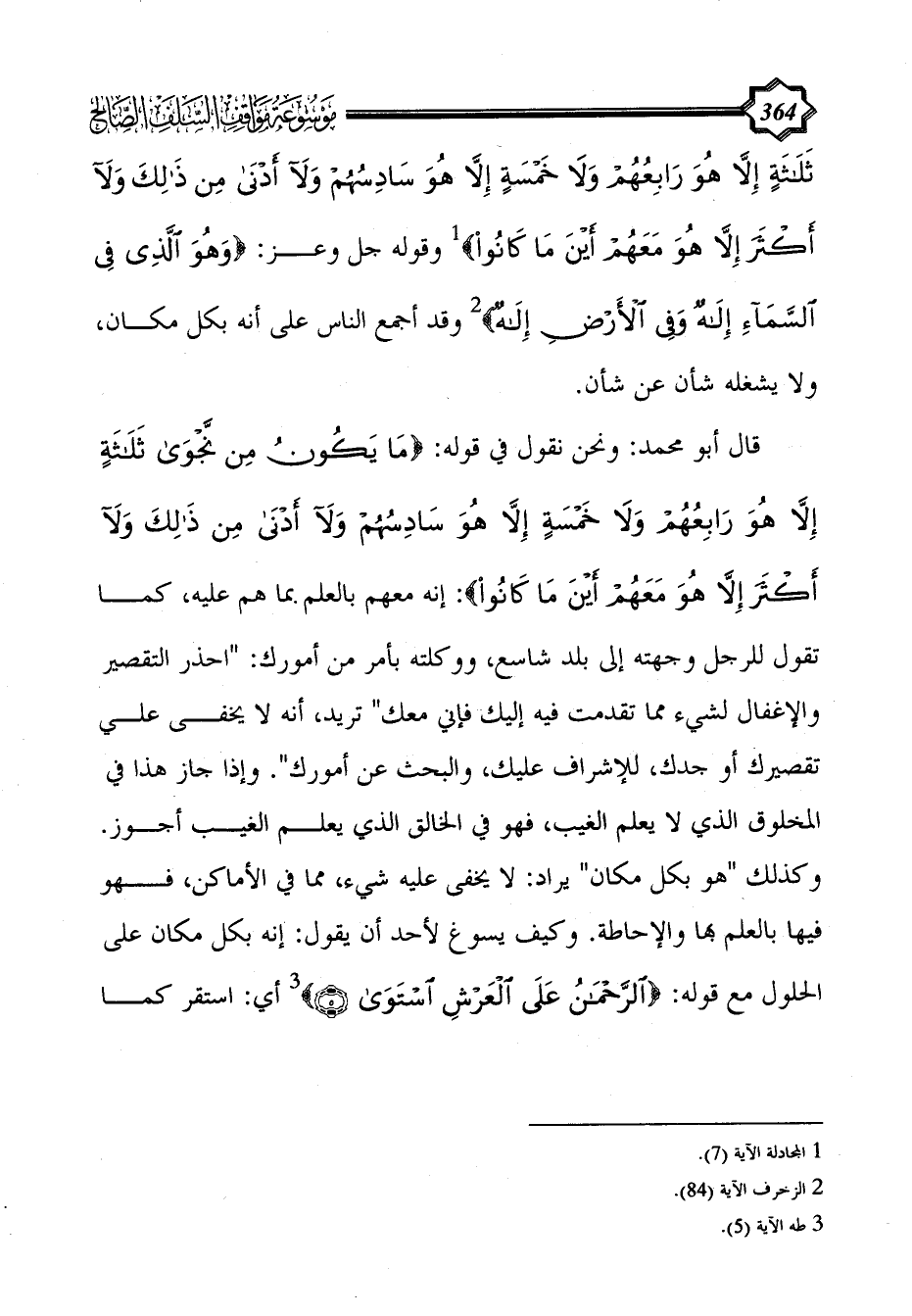 قال أبو محمد: ونحن نقول في قوله: {ما يكون من نجوى ثَلَاثَةٍ إِلَّا هُوَ رَابِعُهُمْ وَلَا خَمْسَةٍ إِلَّا هُوَ سَادِسُهُمْ وَلَا أَدْنَى مِنْ ذَلِكَ وَلَا أَكْثَرَ إِلَّا هُوَ مَعَهُمْ أَيْنَ مَا كَانُوا}: إنه معهم بالعلم بما هم عليه، كما تقول للرجل وجهته إلى بلد شاسع، ووكلته بأمر من أمورك: "احذر التقصير والإغفال لشيء مما تقدمت فيه إليك فإني معك" تريد، أنه لا يخفى علي تقصيرك أو جدك، للإشراف عليك، والبحث عن أمورك". وإذا جاز هذا في المخلوق الذي لا يعلم الغيب، فهو في الخالق الذي يعلم الغيب أجوز. وكذلك "هو بكل مكان" يراد: لا يخفى عليه شيء، مما في الأماكن، فهو فيها بالعلم بها والإحاطة. وكيف يسوغ لأحد أن يقول: إنه بكل مكان على الحلول مع قوله: {الرحمن على العرش استوى} (¬3) أي: استقر كما