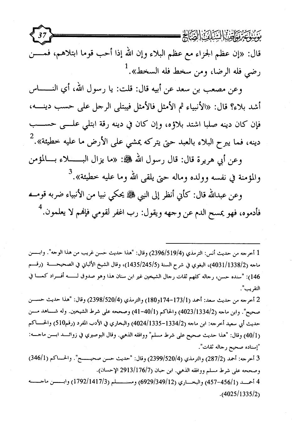وعن مصعب بن سعد عن أبيه قال: قلت: يا رسول الله، أي الناس أشد بلاء؟ قال: "الأنبياء ثم الأمثل فالأمثل فيبتلى الرجل على حسب دينه، فإن كان دينه صلبا اشتد بلاؤه، وإن كان في دينه رقة ابتلي على حسب دينه، فما يبرح البلاء بالعبد حتى يتركه يمشي على الأرض ما عليه خطيئة". (¬2)