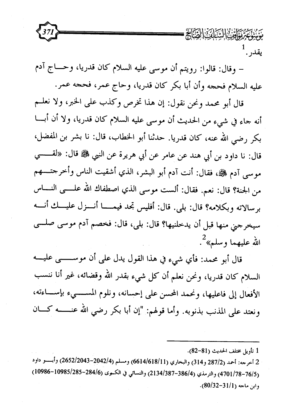- وقال: قالوا: رويتم أن موسى عليه السلام كان قدريا، وحاج آدم عليه السلام فحجه وأن أبا بكر كان قدريا، وحاج عمر، فحجه عمر.
