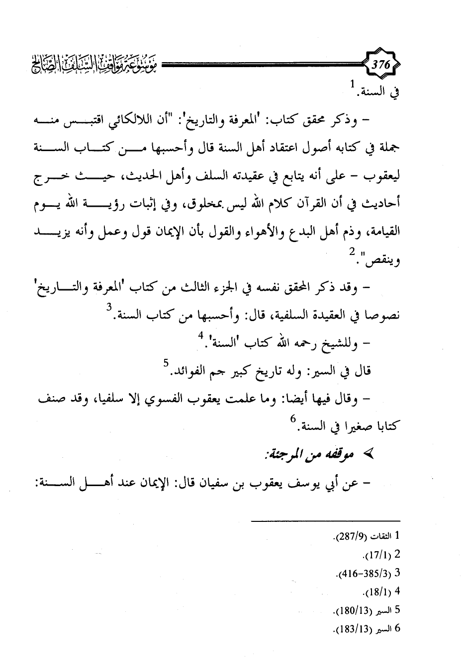 - وقال فيها أيضا: وما علمت يعقوب الفسوي إلا سلفيا، وقد صنف كتابا صغيرا في السنة. (¬6)