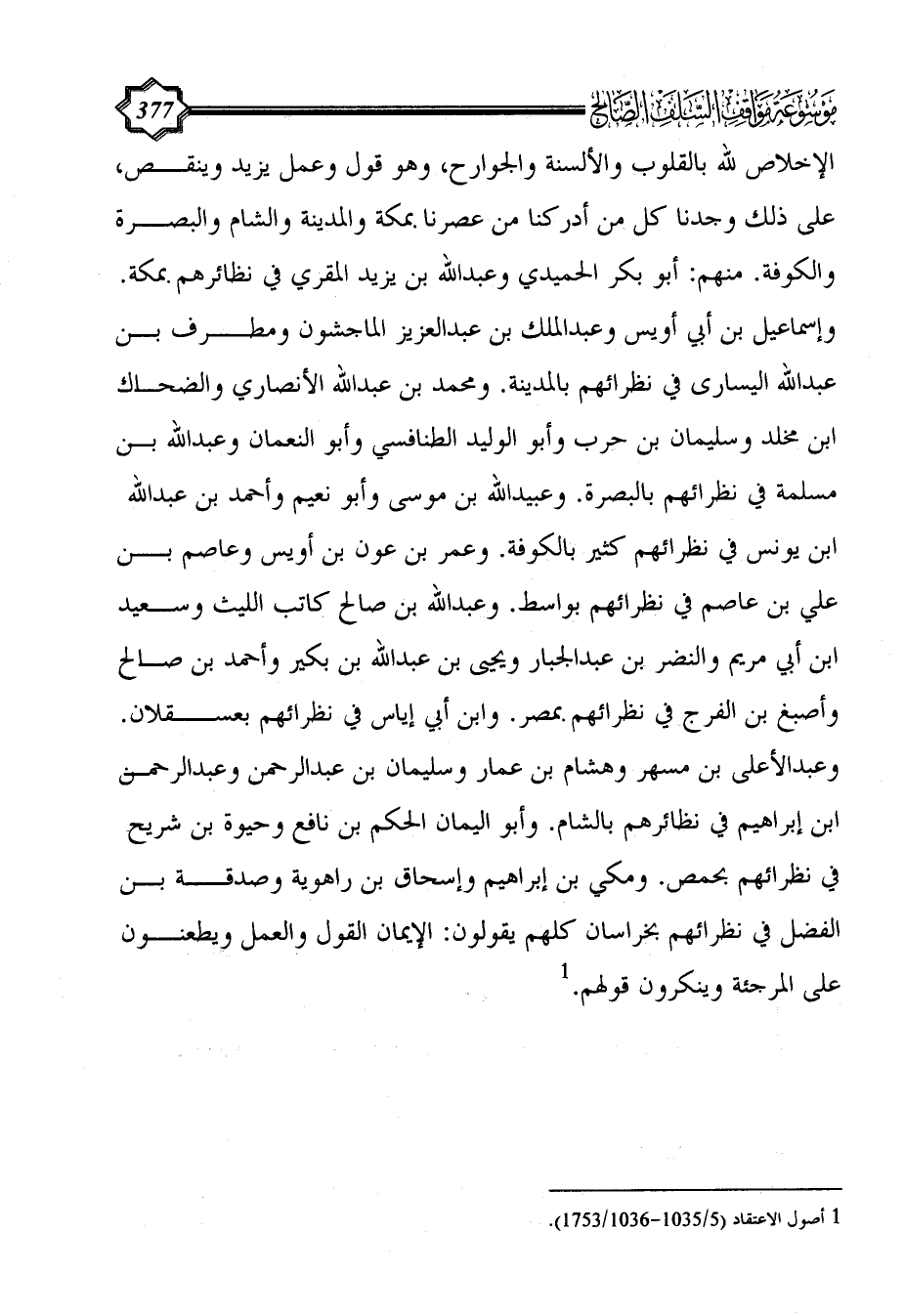 الإخلاص لله بالقلوب والألسنة والجوارح، وهو قول وعمل يزيد وينقص، على ذلك وجدنا كل من أدركنا من عصرنا بمكة والمدينة والشام والبصرة والكوفة. منهم: أبو بكر الحميدي وعبد الله بن يزيد المقري في نظائرهم بمكة. وإسماعيل بن أبي أويس وعبد الملك بن عبد العزيز الماجشون ومطرف بن عبد الله اليسارى في نظرائهم بالمدينة. ومحمد بن عبد الله الأنصاري والضحاك ابن مخلد وسليمان بن حرب وأبو الوليد الطنافسي وأبو النعمان وعبد الله بن مسلمة في نظرائهم بالبصرة. وعبيد الله بن موسى وأبو نعيم وأحمد بن عبد الله ابن يونس في نظرائهم كثير بالكوفة. وعمر بن عون بن أويس وعاصم بن علي بن عاصم في نظرائهم بواسط. وعبد الله بن صالح كاتب الليث وسعيد ابن أبي مريم والنضر بن عبد الجبار ويحيى بن عبد الله بن بكير وأحمد بن صالح وأصبغ بن الفرج في نظرائهم بمصر. وابن أبي إياس في نظرائهم بعسقلان. وعبد الأعلى بن مسهر وهشام بن عمار وسليمان بن عبد الرحمن وعبد الرحمن ابن إبراهيم في نظائرهم بالشام. وأبو اليمان الحكم بن نافع وحيوة بن شريح في نظرائهم بحمص. ومكي بن إبراهيم وإسحاق بن راهوية وصدقة بن الفضل في نظرائهم بخراسان كلهم يقولون: الإيمان القول والعمل ويطعنون على المرجئة وينكرون قولهم. (¬1)