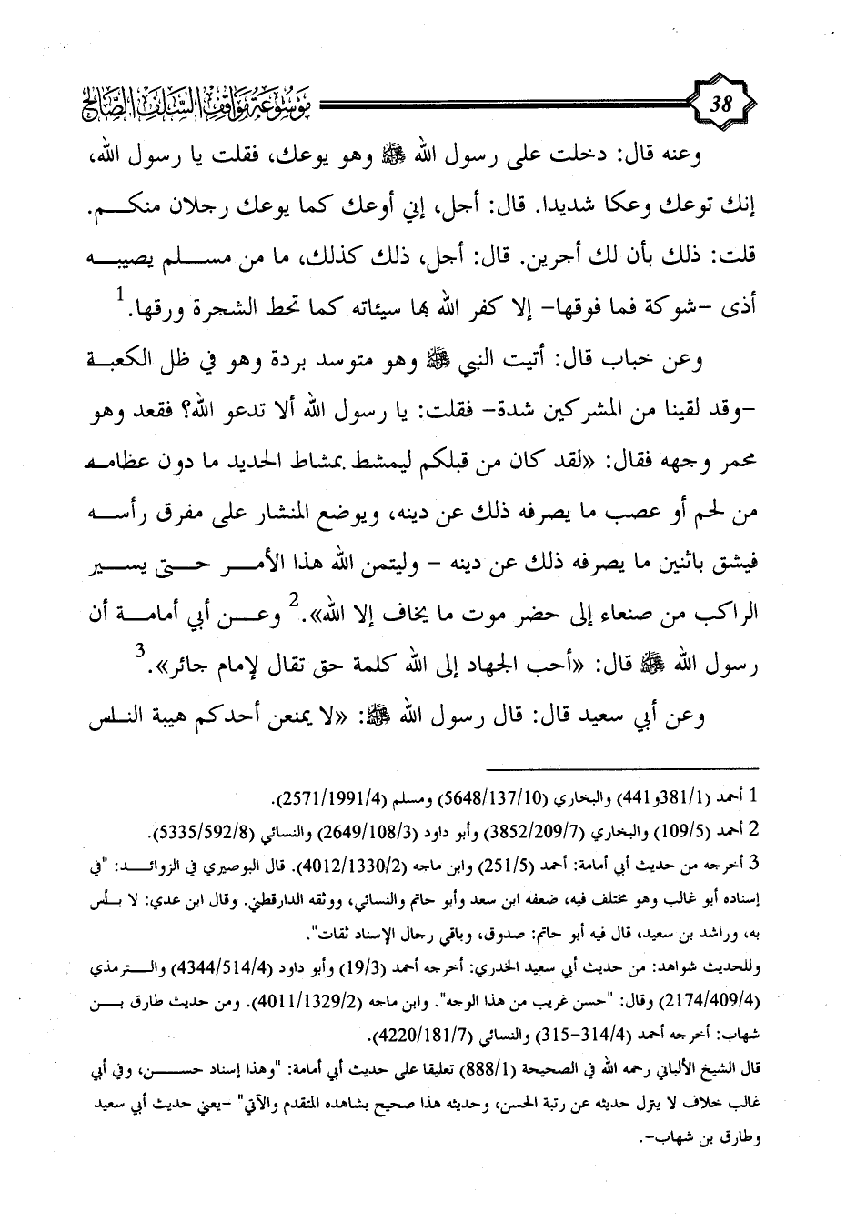 وعن خباب قال: أتيت النبي - صلى الله عليه وسلم - وهو متوسد بردة وهو في ظل الكعبة -وقد لقينا من المشركين شدة- فقلت: يا رسول الله ألا تدعو الله؟ فقعد وهو محمر وجهه فقال: "لقد كان من قبلكم ليمشط بمشاط الحديد ما دون عظامه من لحم أو عصب ما يصرفه ذلك عن دينه، ويوضع المنشار على مفرق رأسه فيشق باثنين ما يصرفه ذلك عن دينه - وليتمن الله هذا الأمر حتى يسير الراكب من صنعاء إلى حضر موت ما يخاف إلا الله". (¬2) وعن أبي أمامة أن رسول الله - صلى الله عليه وسلم - قال: "أحب الجهاد إلى الله كلمة حق تقال لإمام جائر". (¬3)