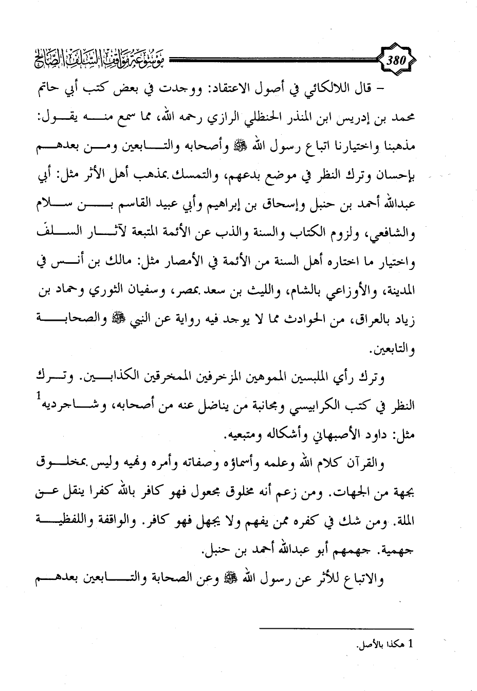 - قال اللالكائي في أصول الاعتقاد: ووجدت في بعض كتب أبي حاتم محمد بن إدريس ابن المنذر الحنظلي الرازي رحمه الله، مما سمع منه يقول: مذهبنا واختيارنا اتباع رسول الله - صلى الله عليه وسلم - وأصحابه والتابعين ومن بعدهم بإحسان وترك النظر في موضع بدعهم، والتمسك بمذهب أهل الأثر مثل: أبي عبد الله أحمد بن حنبل وإسحاق بن إبراهيم وأبي عبيد القاسم بن سلام والشافعي، ولزوم الكتاب والسنة والذب عن الأئمة المتبعة لآثار السلف واختيار ما اختاره أهل السنة من الأئمة في الأمصار مثل: مالك بن أنس في المدينة، والأوزاعي بالشام، والليث بن سعد بمصر، وسفيان الثوري وحماد بن زياد بالعراق، من الحوادث مما لا يوجد فيه رواية عن النبي - صلى الله عليه وسلم - والصحابة والتابعين.