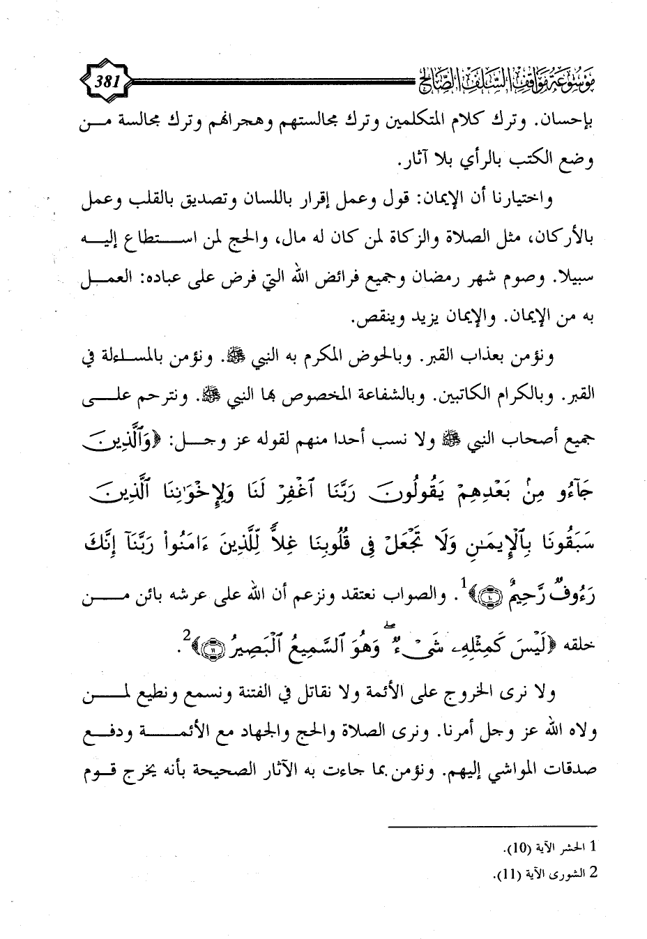 ولا نرى الخروج على الأئمة ولا نقاتل في الفتنة ونسمع ونطيع لمن ولاه الله عز وجل أمرنا. ونرى الصلاة والحج والجهاد مع الأئمة ودفع صدقات المواشي إليهم. ونؤمن بما جاءت به الآثار الصحيحة بأنه يخرج قوم