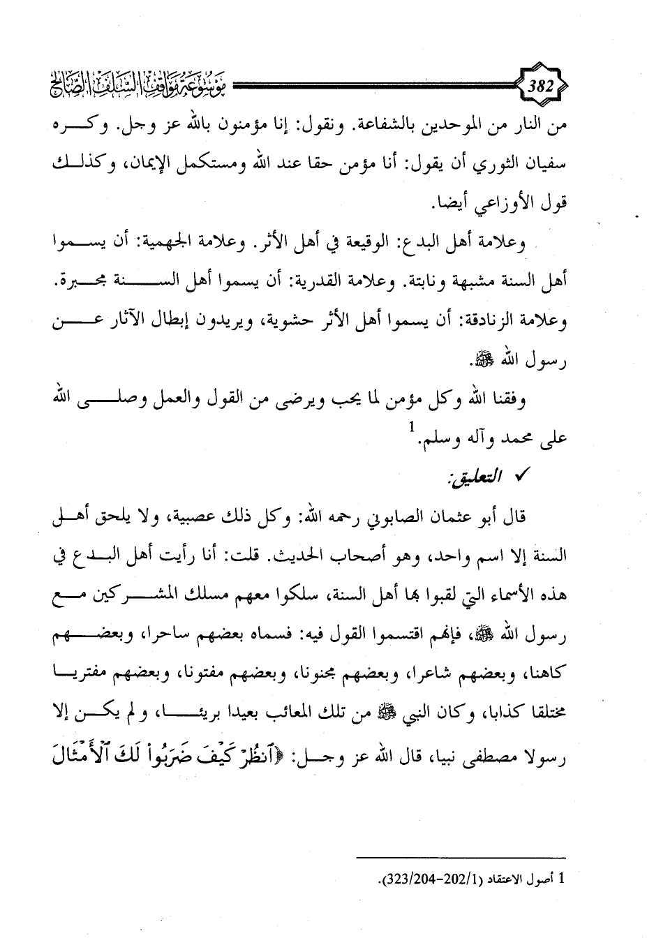 قال أبو عثمان الصابوني رحمه الله: وكل ذلك عصبية، ولا يلحق أهل السنة إلا اسم واحد، وهو أصحاب الحديث. قلت: أنا رأيت أهل البدع في هذه الأسماء التي لقبوا بها أهل السنة، سلكوا معهم مسلك المشركين مع رسول الله - صلى الله عليه وسلم -، فإنهم اقتسموا القول فيه: فسماه بعضهم ساحرا، وبعضهم كاهنا، وبعضهم شاعرا، وبعضهم مجنونا، وبعضهم مفتونا، وبعضهم مفتريا مختلقا كذابا، وكان النبي - صلى الله عليه وسلم - من تلك المعائب بعيدا بريئا، ولم يكن إلا رسولا مصطفى نبيا، قال الله عز وجل: {انْظُرْ كيف ضربوا لَكَ الْأَمْثَالَ