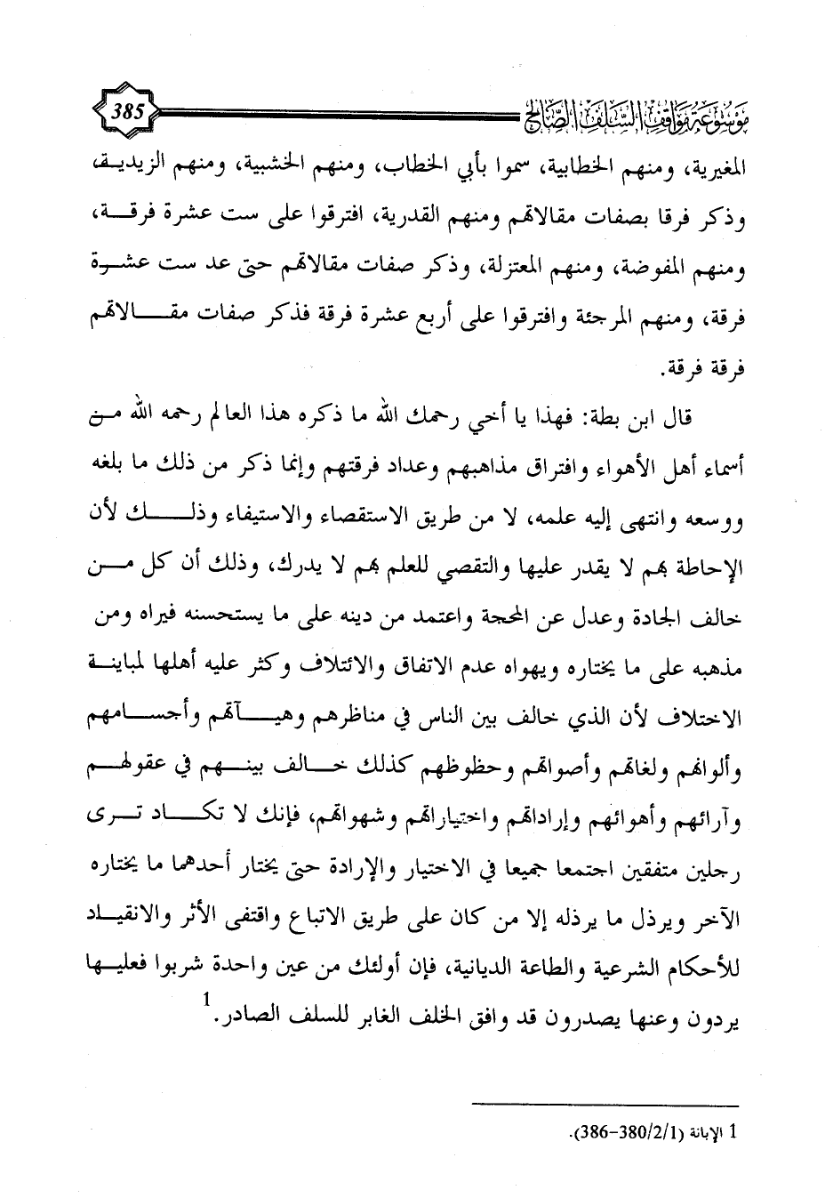 قال ابن بطة: فهذا يا أخي رحمك الله ما ذكره هذا العالم رحمه الله من أسماء أهل الأهواء وافتراق مذاهبهم وعداد فرقتهم وإنما ذكر من ذلك ما بلغه ووسعه وانتهى إليه علمه، لا من طريق الاستقصاء والاستيفاء وذلك لأن الإحاطة بهم لا يقدر عليها والتقصي للعلم بهم لا يدرك، وذلك أن كل من خالف الجادة وعدل عن المحجة واعتمد من دينه على ما يستحسنه فيراه ومن مذهبه على ما يختاره ويهواه عدم الاتفاق والائتلاف وكثر عليه أهلها لمباينة الاختلاف لأن الذي خالف بين الناس في مناظرهم وهيآتهم وأجسامهم وألوانهم ولغاتهم وأصواتهم وحظوظهم كذلك خالف بينهم في عقولهم وآرائهم وأهوائهم وإراداتهم واختياراتهم وشهواتهم، فإنك لا تكاد ترى رجلين متفقين اجتمعا جميعا في الاختيار والإرادة حتى يختار أحدهما ما يختاره الآخر ويرذل ما يرذله إلا من كان على طريق الاتباع واقتفى الأثر والانقياد للأحكام الشرعية والطاعة الديانية، فإن أولئك من عين واحدة شربوا فعليها يردون وعنها يصدرون قد وافق الخلف الغابر للسلف الصادر. (¬1)