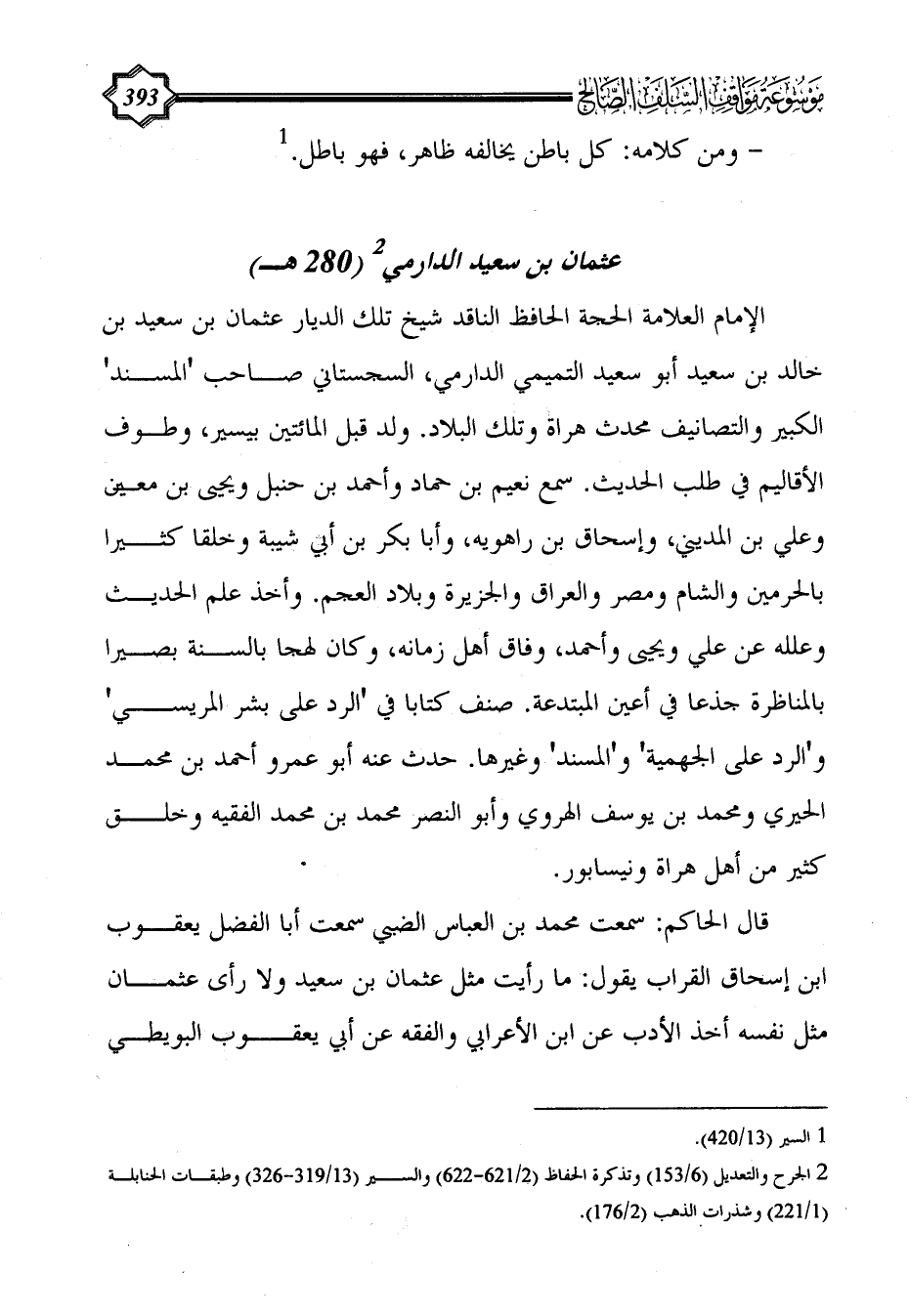 الإمام العلامة الحجة الحافظ الناقد شيخ تلك الديار عثمان بن سعيد بن خالد بن سعيد أبو سعيد التميمي الدارمي، السجستاني صاحب 'المسند' الكبير والتصانيف محدث هراة وتلك البلاد. ولد قبل المائتين بيسير، وطوف الأقاليم في طلب الحديث. سمع نعيم بن حماد وأحمد بن حنبل ويحيى بن معين وعلي بن المديني، وإسحاق بن راهويه، وأبا بكر بن أبي شيبة وخلقا كثيرا بالحرمين والشام ومصر والعراق والجزيرة وبلاد العجم. وأخذ علم الحديث وعلله عن علي ويحيى وأحمد، وفاق أهل زمانه، وكان لهجا بالسنة بصيرا بالمناظرة جذعا في أعين المبتدعة. صنف كتابا في 'الرد على بشر المريسي' و'الرد على الجهمية' و'المسند' وغيرها. حدث عنه أبو عمرو أحمد بن محمد الحيري ومحمد بن يوسف الهروي وأبو النصر محمد بن محمد الفقيه وخلق كثير من أهل هراة ونيسابور.