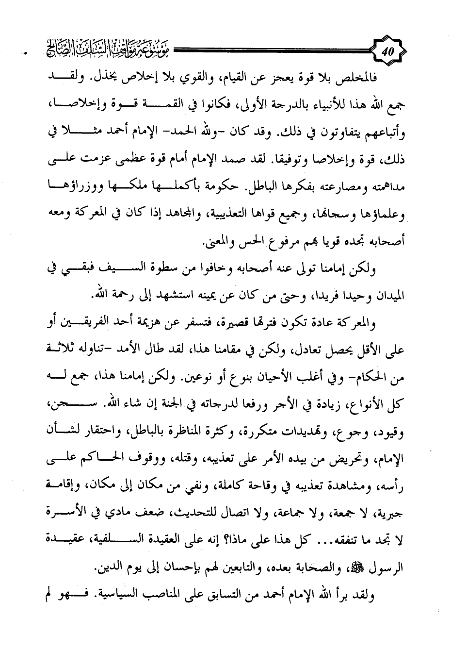 فالمخلص بلا قوة يعجز عن القيام، والقوي بلا إخلاص يخذل. ولقد جمع الله هذا للأنبياء بالدرجة الأولى، فكانوا في القمة قوة وإخلاصا، وأتباعهم يتفاوتون في ذلك. وقد كان -ولله الحمد- الإمام أحمد مثلا في ذلك، قوة وإخلاصا وتوفيقا. لقد صمد الإمام أمام قوة عظمى عزمت على مداهمته ومصارعته بفكرها الباطل. حكومة بأكملها ملكها ووزراؤها وعلماؤها وسجانها، وجميع قواها التعذيبية، والمجاهد إذا كان في المعركة ومعه أصحابه تجده قويا بهم مرفوع الحس والمعنى.