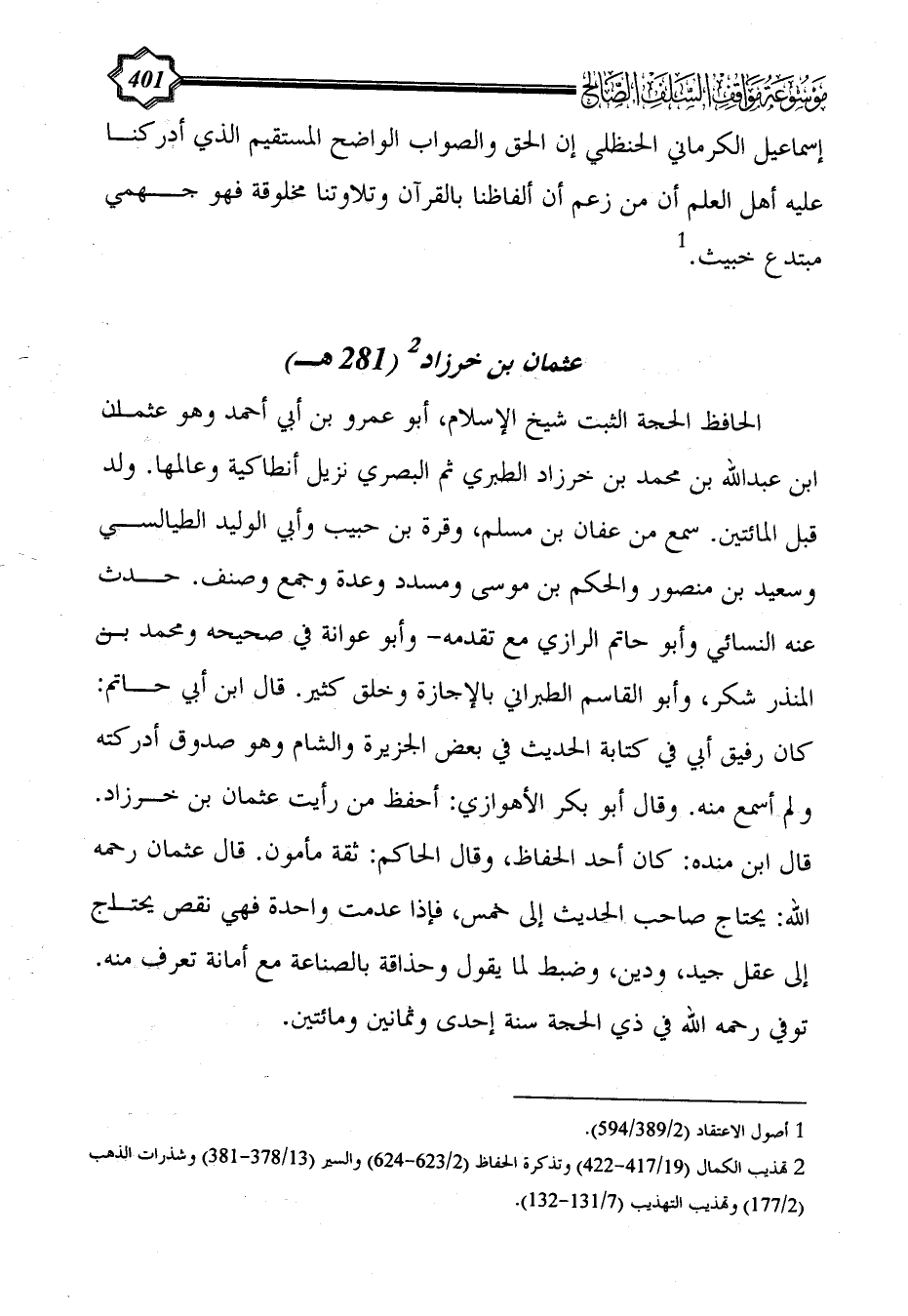 الحافظ الحجة الثبت شيخ الإسلام، أبو عمرو بن أبي أحمد وهو عثمان ابن عبد الله بن محمد بن خرزاد الطبري ثم البصري نزيل أنطاكية وعالمها. ولد قبل المائتين. سمع من عفان بن مسلم، وقرة بن حبيب وأبي الوليد الطيالسي وسعيد بن منصور والحكم بن موسى ومسدد وعدة وجمع وصنف. حدث عنه النسائي وأبو حاتم الرازي مع تقدمه- وأبو عوانة في صحيحه ومحمد بن المنذر شكر، وأبو القاسم الطبراني بالإجازة وخلق كثير. قال ابن أبي حاتم: كان رفيق أبي في كتابة الحديث في بعض الجزيرة والشام وهو صدوق أدركته ولم أسمع منه. وقال أبو بكر الأهوازي: أحفظ من رأيت عثمان بن خرزاد. قال ابن منده: كان أحد الحفاظ، وقال الحاكم: ثقة مأمون. قال عثمان رحمه الله: يحتاج صاحب الحديث إلى خمس، فإذا عدمت واحدة فهي نقص يحتاج إلى عقل جيد، ودين، وضبط لما يقول وحذاقة بالصناعة مع أمانة تعرف منه. توفي رحمه الله في ذي الحجة سنة إحدى وثمانين ومائتين.