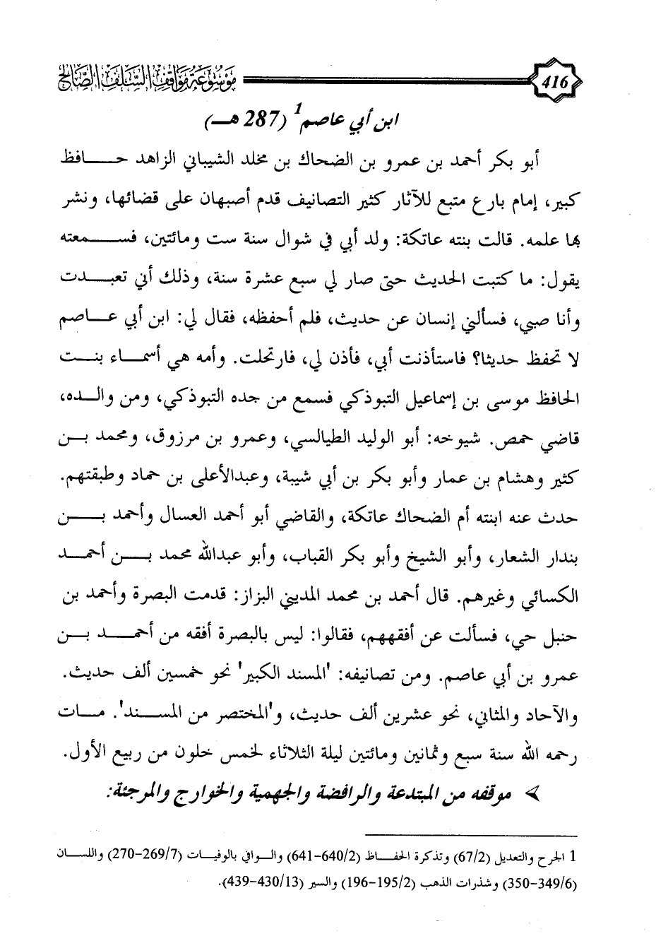 أبو بكر أحمد بن عمرو بن الضحاك بن مخلد الشيباني الزاهد حافظ كبير، إمام بارع متبع للآثار كثير التصانيف قدم أصبهان على قضائها، ونشر بها علمه. قالت بنته عاتكة: ولد أبي في شوال سنة ست ومائتين، فسمعته يقول: ما كتبت الحديث حتى صار لي سبع عشرة سنة، وذلك أني تعبدت وأنا صبي، فسألني إنسان عن حديث، فلم أحفظه، فقال لي: ابن أبي عاصم لا تحفظ حديثا؟ فاستأذنت أبي، فأذن لي، فارتحلت. وأمه هي أسماء بنت الحافظ موسى بن إسماعيل التبوذكي فسمع من جده التبوذكي، ومن والده، قاضي حمص. شيوخه: أبو الوليد الطيالسي، وعمرو بن مرزوق، ومحمد بن كثير وهشام بن عمار وأبو بكر بن أبي شيبة، وعبد الأعلى بن حماد وطبقتهم. حدث عنه ابنته أم الضحاك عاتكة، والقاضي أبو أحمد العسال وأحمد بن بندار الشعار، وأبو الشيخ وأبو بكر القباب، وأبو عبد الله محمد بن أحمد الكسائي وغيرهم. قال أحمد بن محمد المديني البزاز: قدمت البصرة وأحمد بن حنبل حي، فسألت عن أفقههم، فقالوا: ليس بالبصرة أفقه من أحمد بن عمرو بن أبي عاصم. ومن تصانيفه: 'المسند الكبير' نحو خمسين ألف حديث. والآحاد والمثاني، نحو عشرين ألف حديث، و'المختصر من المسند'. مات رحمه الله سنة سبع وثمانين ومائتين ليلة الثلاثاء لخمس خلون من ربيع الأول.