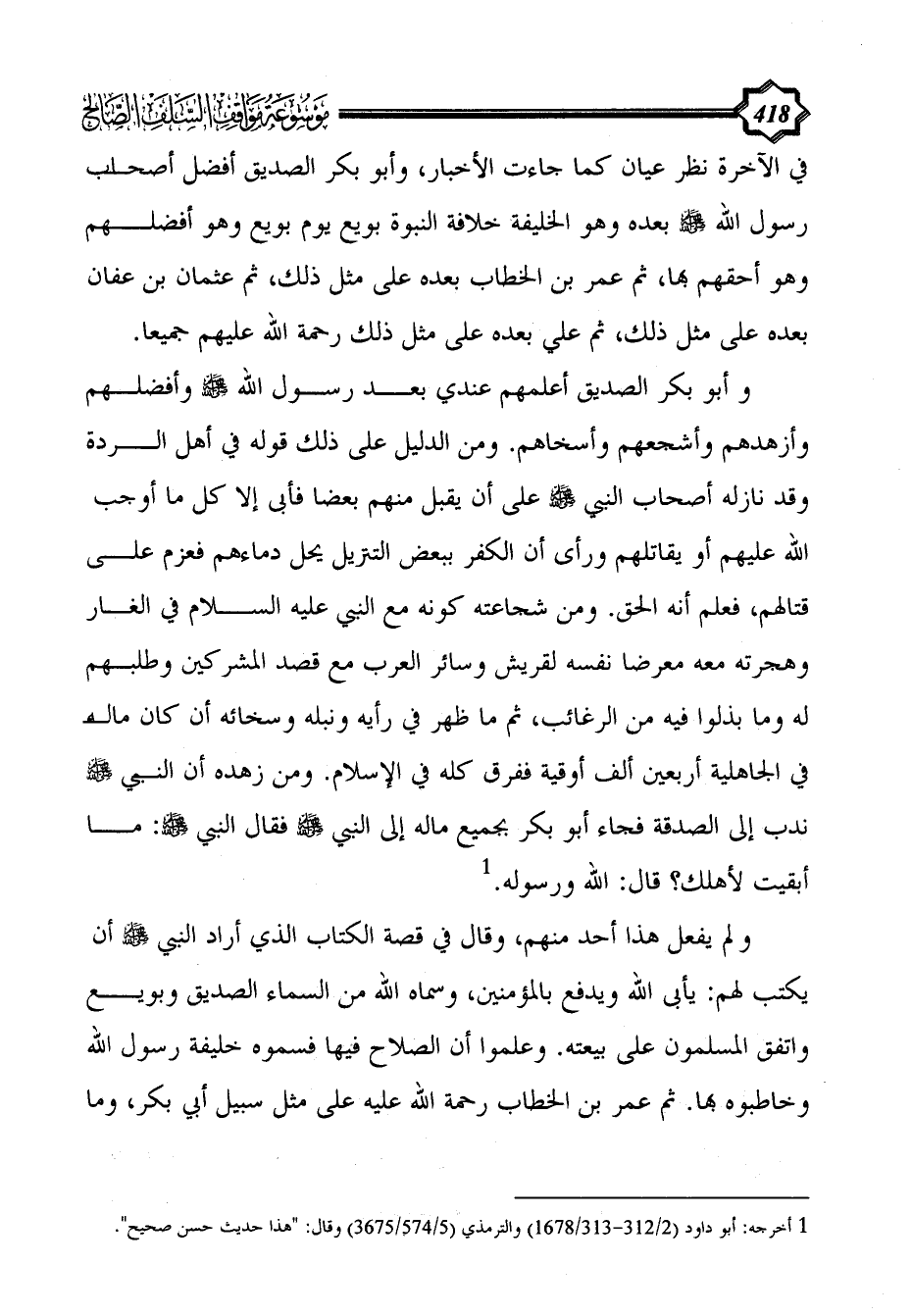 وأبو بكر الصديق أعلمهم عندي بعد رسول الله - صلى الله عليه وسلم - وأفضلهم وأزهدهم وأشجعهم وأسخاهم. ومن الدليل على ذلك قوله في أهل الردة وقد نازله أصحاب النبي - صلى الله عليه وسلم - على أن يقبل منهم بعضا فأبى إلا كل ما أوجب الله عليهم أو يقاتلهم ورأى أن الكفر ببعض التنزيل يحل دماءهم فعزم على قتالهم، فعلم أنه الحق. ومن شجاعته كونه مع النبي عليه السلام في الغار وهجرته معه معرضا نفسه لقريش وسائر العرب مع قصد المشركين وطلبهم له وما بذلوا فيه من الرغائب، ثم ما ظهر في رأيه ونبله وسخائه أن كان ماله في الجاهلية أربعين ألف أوقية ففرق كله في الإسلام. ومن زهده أن النبي - صلى الله عليه وسلم - ندب إلى الصدقة فجاء أبو بكر بجميع ماله إلى النبي - صلى الله عليه وسلم - فقال النبي - صلى الله عليه وسلم -: ما أبقيت لأهلك؟ قال: الله ورسوله. (¬1)