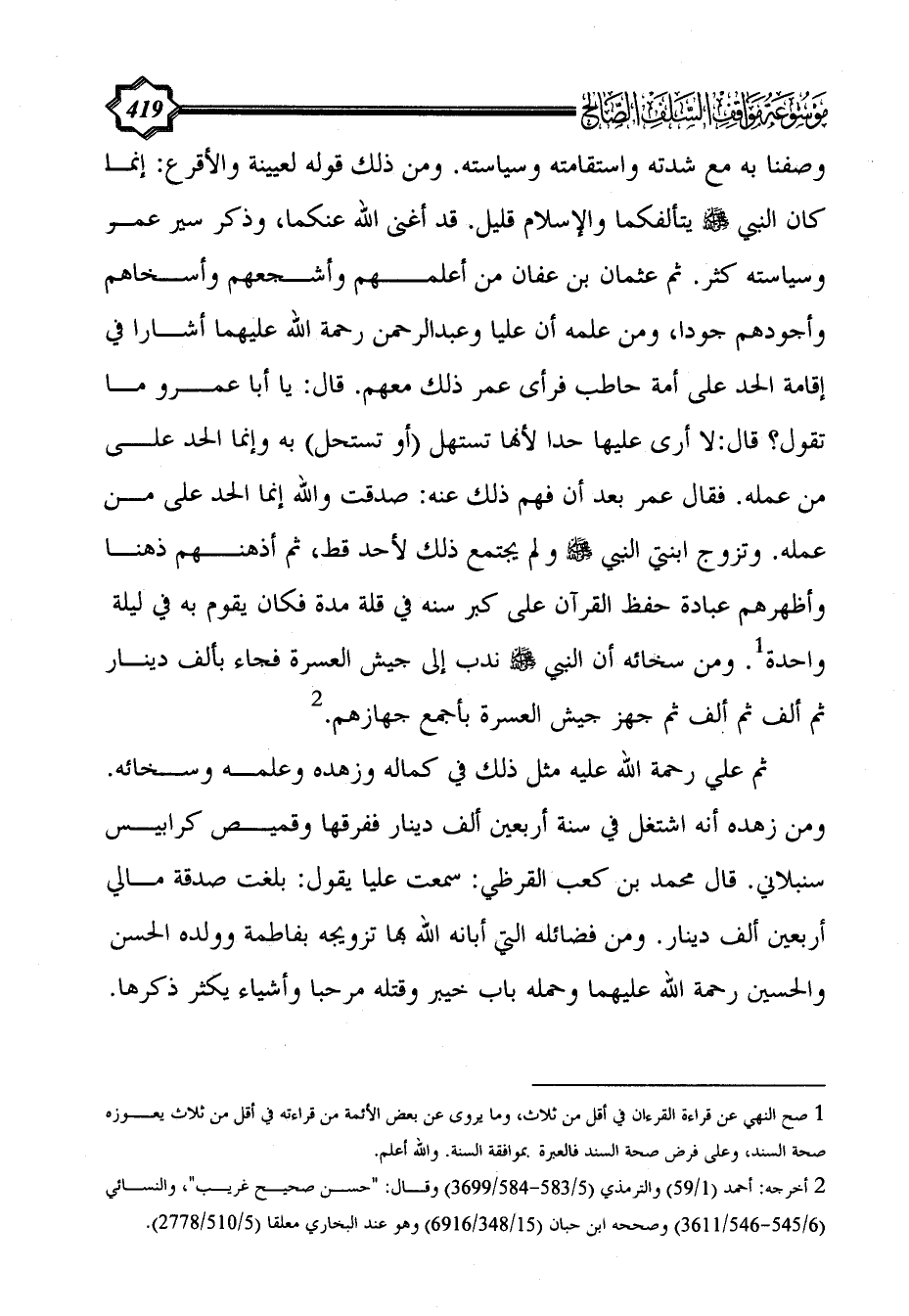 وصفنا به مع شدته واستقامته وسياسته. ومن ذلك قوله لعيينة والأقرع: إنما كان النبي - صلى الله عليه وسلم - يتألفكما والإسلام قليل. قد أغنى الله عنكما، وذكر سير عمر وسياسته كثر. ثم عثمان بن عفان من أعلمهم وأشجعهم وأسخاهم وأجودهم جودا، ومن علمه أن عليا وعبد الرحمن رحمة الله عليهما أشارا في إقامة الحد على أمة حاطب فرأى عمر ذلك معهم. قال: يا أبا عمرو ما تقول؟ قال: لا أرى عليها حدا لأنها تستهل (أو تستحل) به وإنما الحد على من عمله. فقال عمر بعد أن فهم ذلك عنه: صدقت والله إنما الحد على من عمله. وتزوج ابنتي النبي - صلى الله عليه وسلم - ولم يجتمع ذلك لأحد قط، ثم أذهنهم ذهنا وأظهرهم عبادة حفظ القرآن على كبر سنه في قلة مدة فكان يقوم به في ليلة واحدة (¬1). ومن سخائه أن النبي - صلى الله عليه وسلم - ندب إلى جيش العسرة فجاء بألف دينار ثم ألف ثم ألف ثم جهز جيش العسرة بأجمع جهازهم. (¬2)