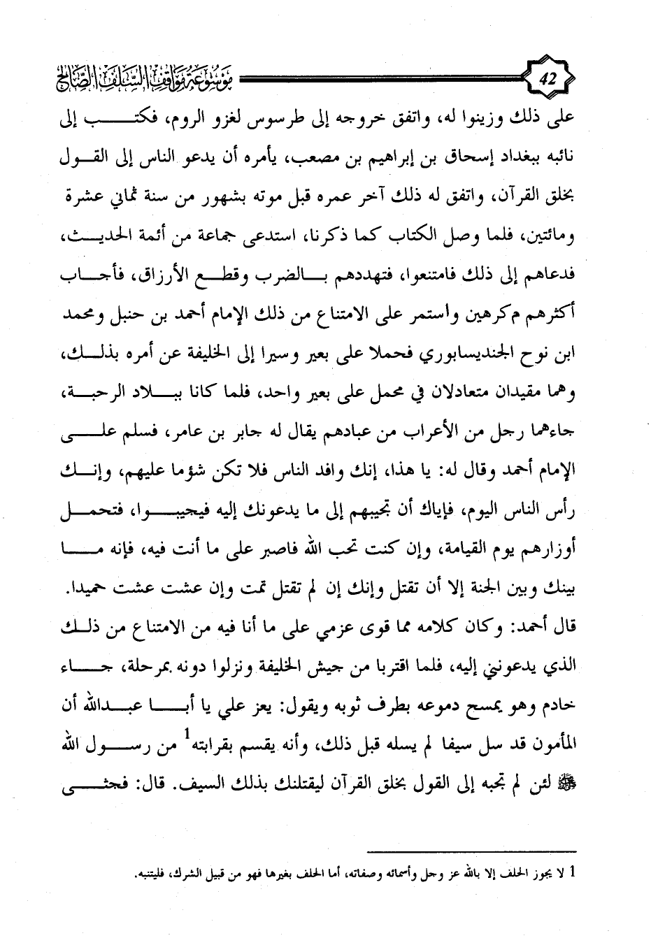على ذلك وزينوا له، واتفق خروجه إلى طرسوس لغزو الروم، فكتب إلى نائبه ببغداد إسحاق بن إبراهيم بن مصعب، يأمره أن يدعو الناس إلى القول بخلق القرآن، واتفق له ذلك آخر عمره قبل موته بشهور من سنة ثماني عشرة ومائتين، فلما وصل الكتاب كما ذكرنا، استدعى جماعة من أئمة الحديث، فدعاهم إلى ذلك فامتنعوا، فتهددهم بالضرب وقطع الأرزاق، فأجاب أكثرهم مكرهين واستمر على الامتناع من ذلك الإمام أحمد بن حنبل ومحمد ابن نوح الجنديسابوري فحملا على بعير وسيرا إلى الخليفة عن أمره بذلك، وهما مقيدان متعادلان في محمل على بعير واحد، فلما كانا ببلاد الرحبة، جاءهما رجل من الأعراب من عبادهم يقال له جابر بن عامر، فسلم على الإمام أحمد وقال له: يا هذا، إنك وافد الناس فلا تكن شؤما عليهم، وإنك رأس الناس اليوم، فإياك أن تجيبهم إلى ما يدعونك إليه فيجيبوا، فتحمل أوزارهم يوم القيامة، وإن كنت تحب الله فاصبر على ما أنت فيه، فإنه ما بينك وبين الجنة إلا أن تقتل وإنك إن لم تقتل تمت وإن عشت عشت حميدا. قال أحمد: وكان كلامه مما قوى عزمي على ما أنا فيه من الامتناع من ذلك الذي يدعونني إليه، فلما اقتربا من جيش الخليفة ونزلوا دونه بمرحلة، جاء خادم وهو يمسح دموعه بطرف ثوبه ويقول: يعز علي يا أبا عبد الله أن المأمون قد سل سيفا لم يسله قبل ذلك، وأنه يقسم بقرابته (¬1)