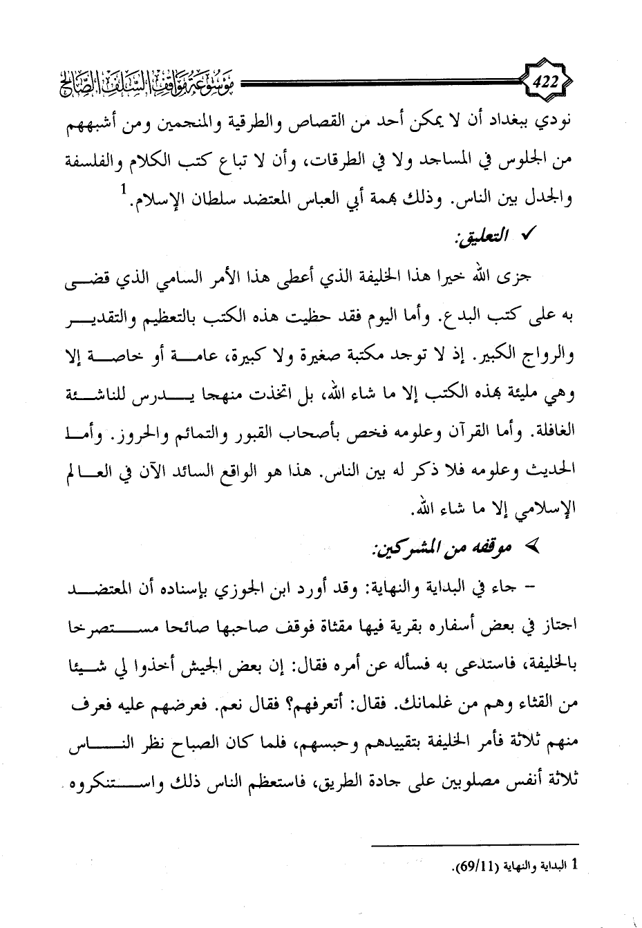 جزى الله خيرا هذا الخليفة الذي أعطى هذا الأمر السامي الذي قضى به على كتب البدع. وأما اليوم فقد حظيت هذه الكتب بالتعظيم والتقدير والرواج الكبير. إذ لا توجد مكتبة صغيرة ولا كبيرة، عامة أو خاصة إلا وهي مليئة بهذه الكتب إلا ما شاء الله، بل اتخذت منهجا يدرس للناشئة الغافلة. وأما القرآن وعلومه فخص بأصحاب القبور والتمائم والحروز. وأما الحديث وعلومه فلا ذكر له بين الناس. هذا هو الواقع السائد الآن في العالم الإسلامي إلا ما شاء الله.
