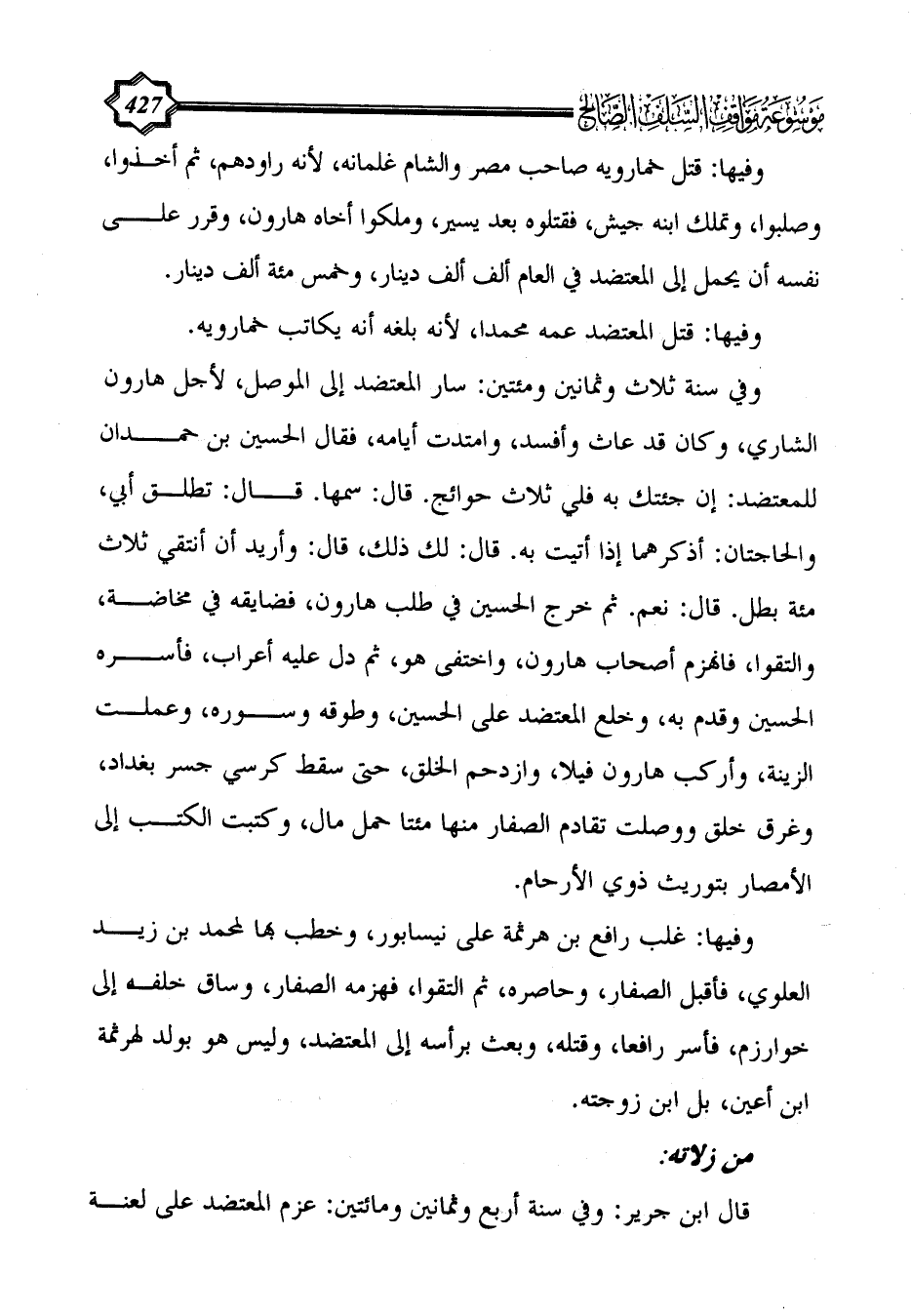 وفي سنة ثلاث وثمانين ومئتين: سار المعتضد إلى الموصل، لأجل هارون الشاري، وكان قد عاث وأفسد، وامتدت أيامه، فقال الحسين بن حمدان للمعتضد: إن جئتك به فلي ثلاث حوائج. قال: سمها. قال: تطلق أبي، والحاجتان: أذكرهما إذا أتيت به. قال: لك ذلك، قال: وأريد أن أنتقي ثلاث مئة بطل. قال: نعم. ثم خرج الحسين في طلب هارون، فضايقه في مخاضةٍ، والتقوا، فانهزم أصحاب هارون، واختفى هو، ثم دل عليه أعراب، فأسره الحسين وقدم به، وخلع المعتضد على الحسين، وطوقه وسوره، وعملت الزينة، وأركب هارون فيلا، وازدحم الخلق، حتى سقط كرسي جسر بغداد، وغرق خلق ووصلت تقادم الصفار منها مئتا حمل مال، وكتبت الكتب إلى الأمصار بتوريث ذوي الأرحام.